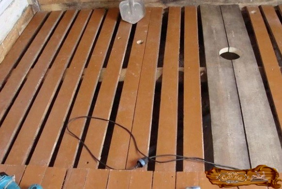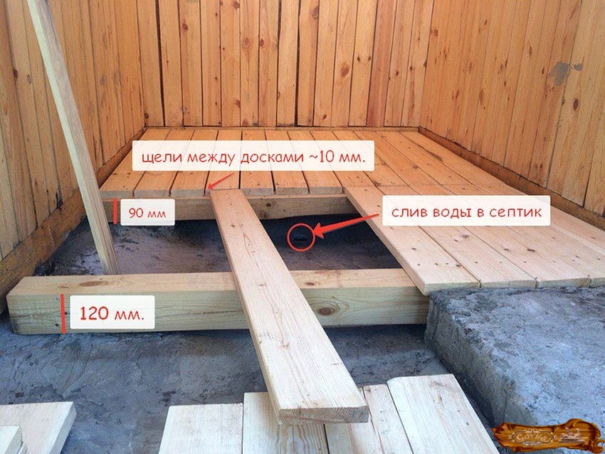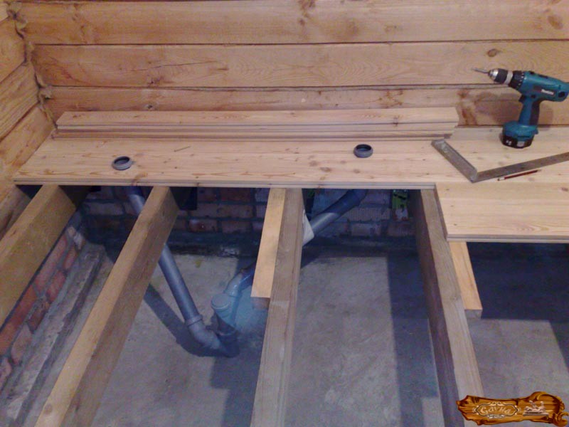 Для пола в душевой нужна совсем другая технология. Для этого помещения можно даже сделать отдельный фундамент. Лагами для такого пола служат асбестоцементные трубы. Сверху на них стелится обрезная доска толщиной примерно 5 см. Между досками необходимо оставить небольшие зазоры в 5-6 мм. По завершении всех этапом пол прижимают плинтусами.