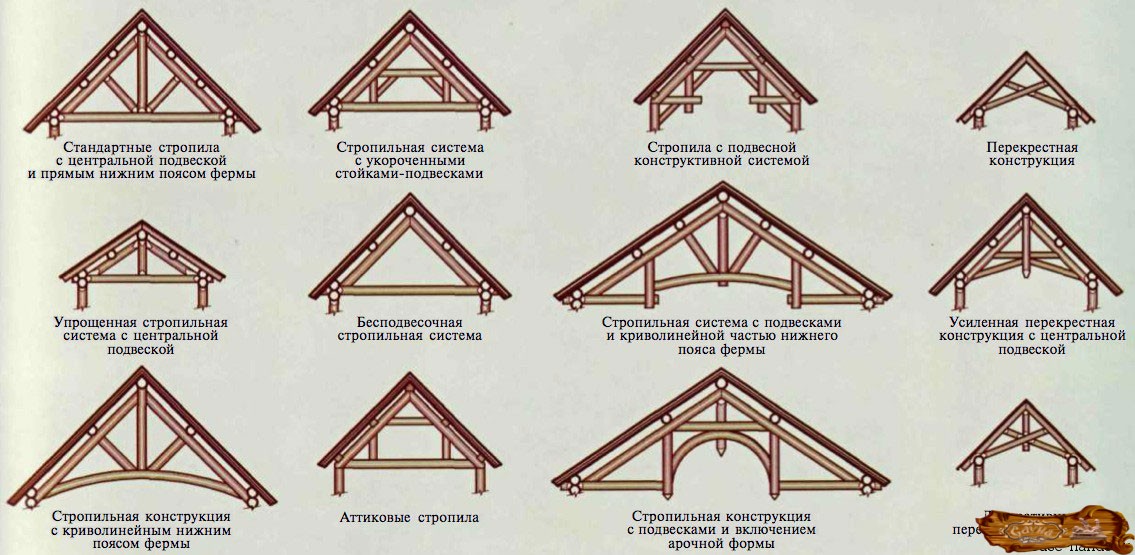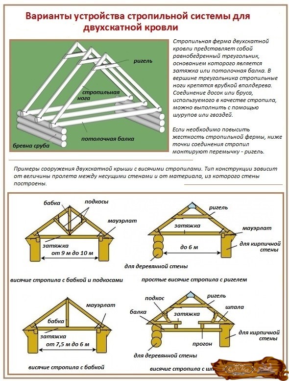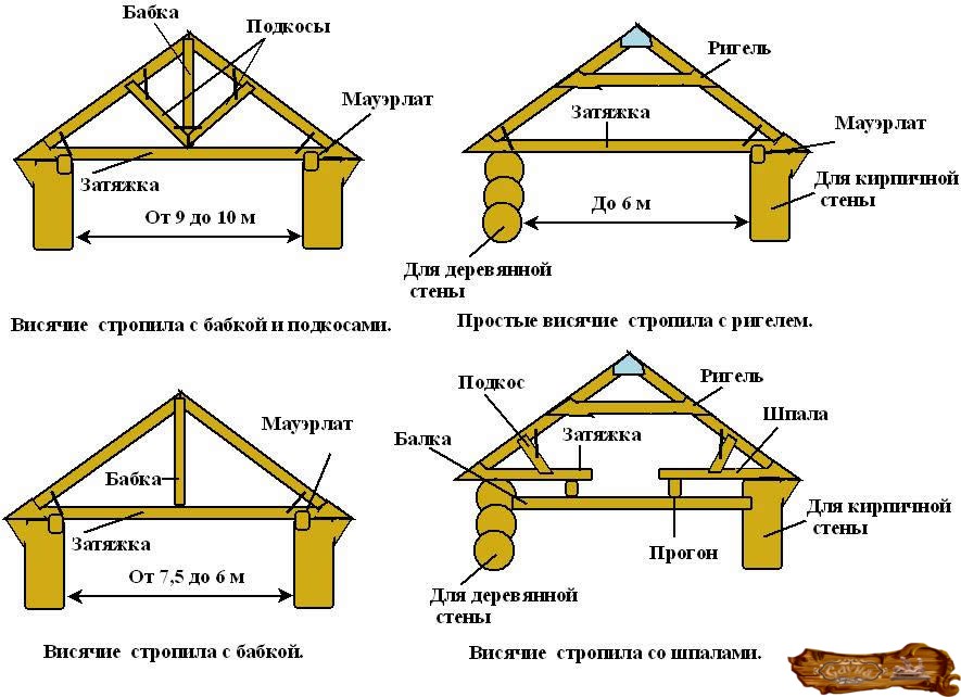 Стропила бывают висячие и наслонные. Рассмотрим подробнее каждую из разновидностей.