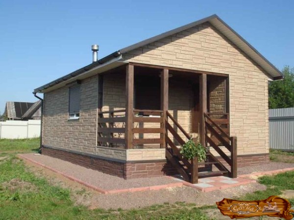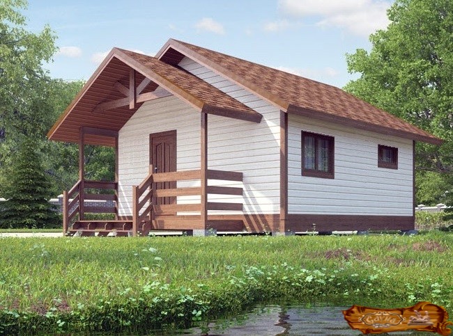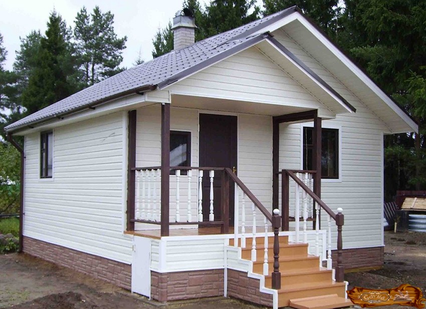 Вариант каркасной бани с небольшой верандой. Смотрится довольно просто и в то же время соблюдены все основные правила декора.