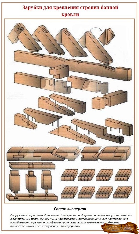 Стропила – основа будущей крыши. Легче всего строить из готовых элементов, соединяя их саморезами или шурупами. Зарубки стоит делать исключительно в точках опоры, а какие именно и где – показано на схеме.