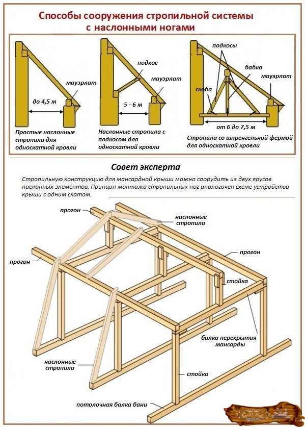 Этот тип чаще используют для односкатных крыш. Тут не нужны затяжки для укладки стропил. Они устанавливаются просто вдоль ската и опираются на мауэрлат, который, в свою очередь, опирается на несущие стены. Варианты возведения системы с наслонными стропилами показаны на схеме: