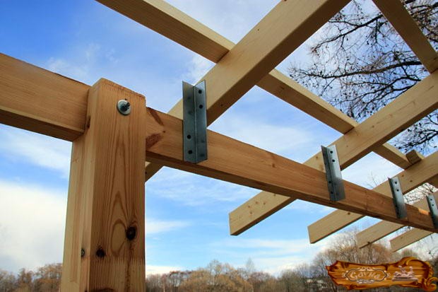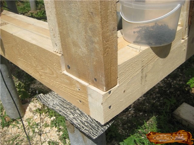 Материалом для каркаса может быть деревянный брус или металлический профиль. Чаще всего дачники отдают предпочтение брусу: он мало весит и его легко собирать. Оптимальным сечением считается 5 на 10 для опор и 10 на 10 для стоек на углах. Доски для обшивки потолка берут толщиной 34 см и шириной 13-15 см.