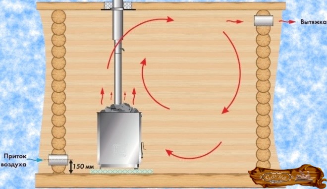 Вариант размещения топки прямо в парной не популярен. Ведь она занимает много места, а от дров и угля постоянно остается мусор на полу. Но для такого помещения существуют отдельные правила обустройства вентиляции. Как ни странно, тут все гораздо проще.
