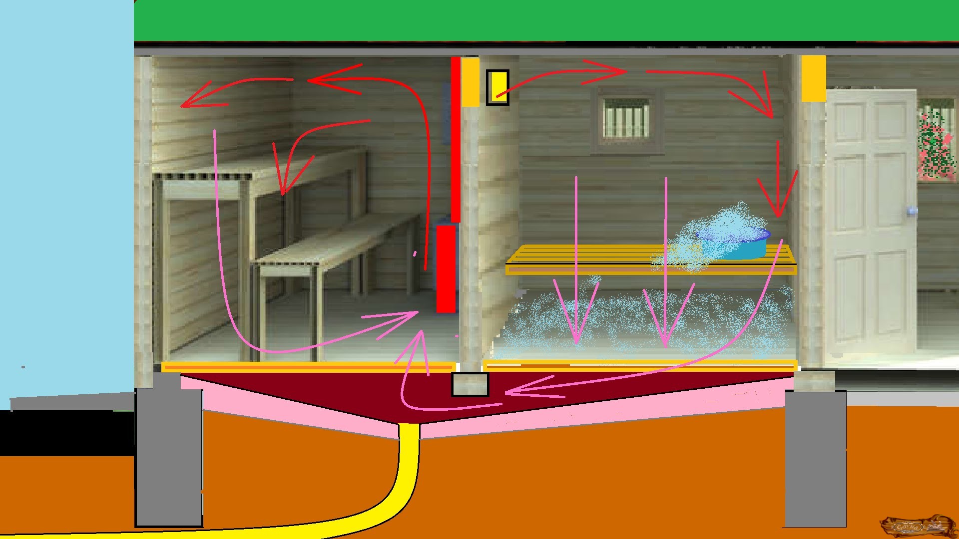 Подойдет смежная вентиляция, а для попадания горячего пара в парилку нужно организовать своеобразный тоннель под полом. Его роль может выполнять обычная труба. На обоих концах этой трубы следует установить решетку, а на выходе нужна задвижка, чтобы регулировать поступление воздуха внутрь.