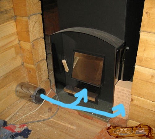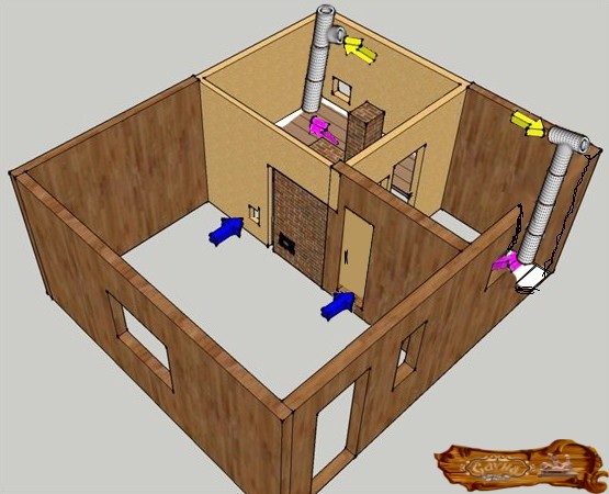 Приточная труба должна располагаться довольно близко к топке, но ниже уровня дымохода. Вытяжные трубы зачастую размещают в противоположной стене под самым потолком.
