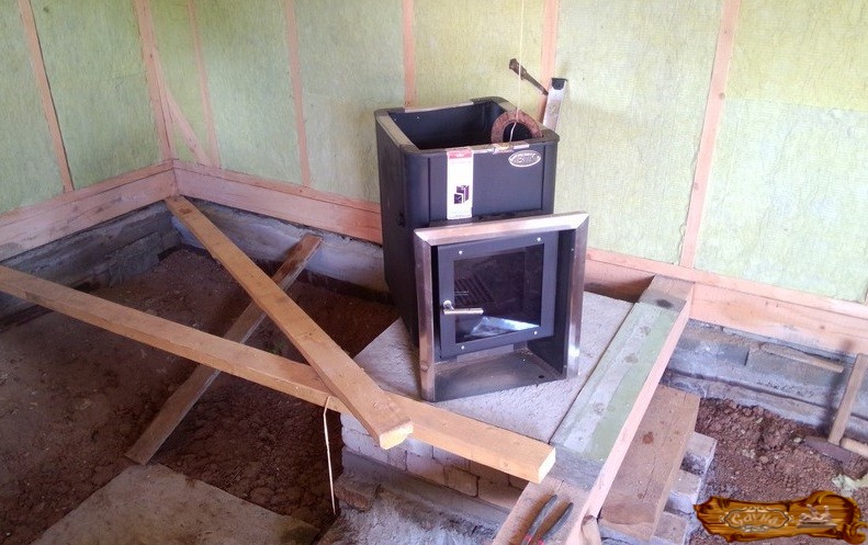 Такой вариант размещения печи самый распространенный. Его существенным плюсом можно назвать отсутствие мусора в парной и сохранение тепла (т. к. не придется часто открывать дверь).