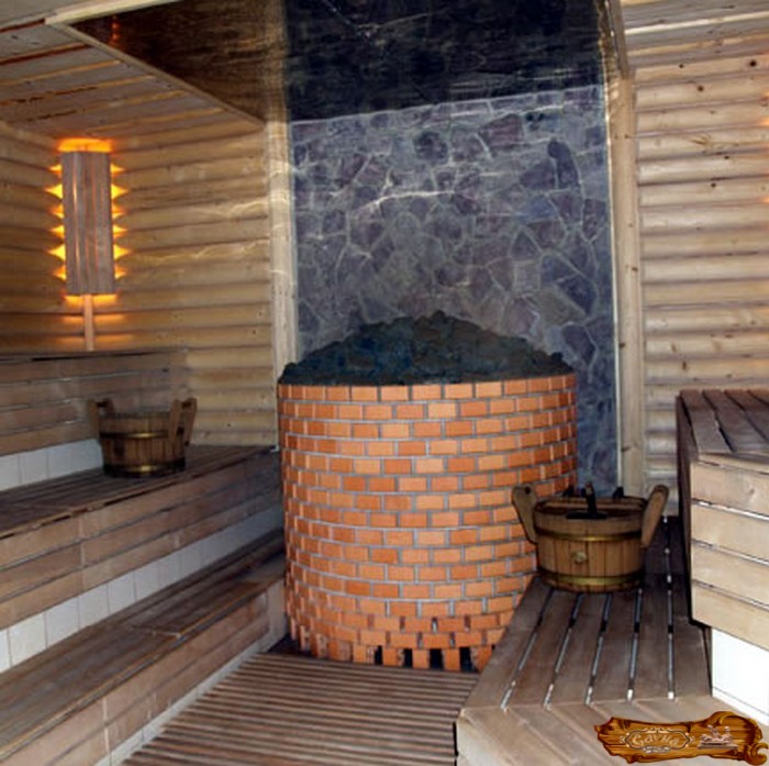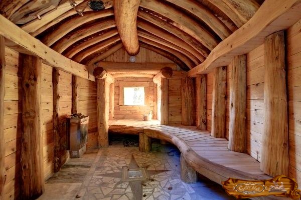 На оформления такой парилки уйдет масса времени и сил, зато результат смотрится невероятно масштабно и величественно. В такую баню захочется приводить гостей постоянно, ведь габариты позволяют разместить довольно много людей.