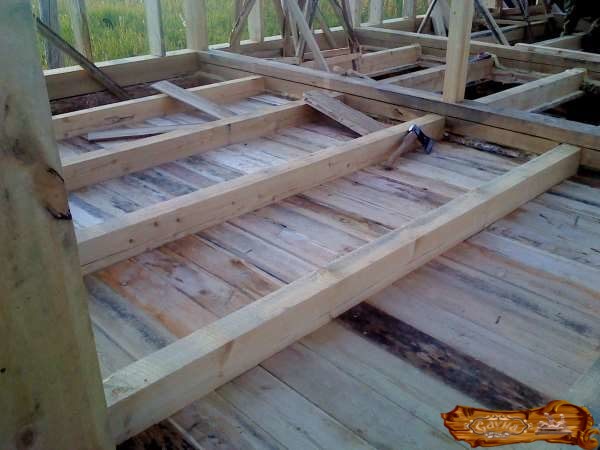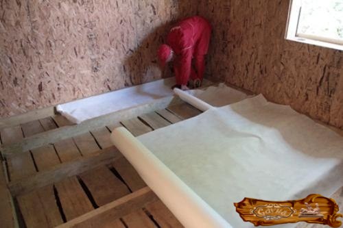 В остальных помещениях (парилка, раздевалка и комната для отдыха) полы монтируются тоже довольно просто. Брусья крепятся к лагам, а наверх кладутся доски для чернового пола. На них укладывается рубероид и утеплитель в толщину около 10 см. Устанавливая доски для чистового пола, нужно не забыть про оборудование пароизоляции с помощью пергамина.