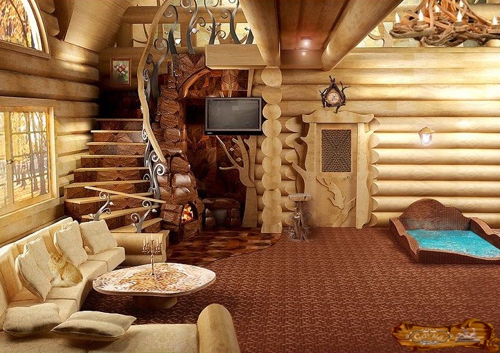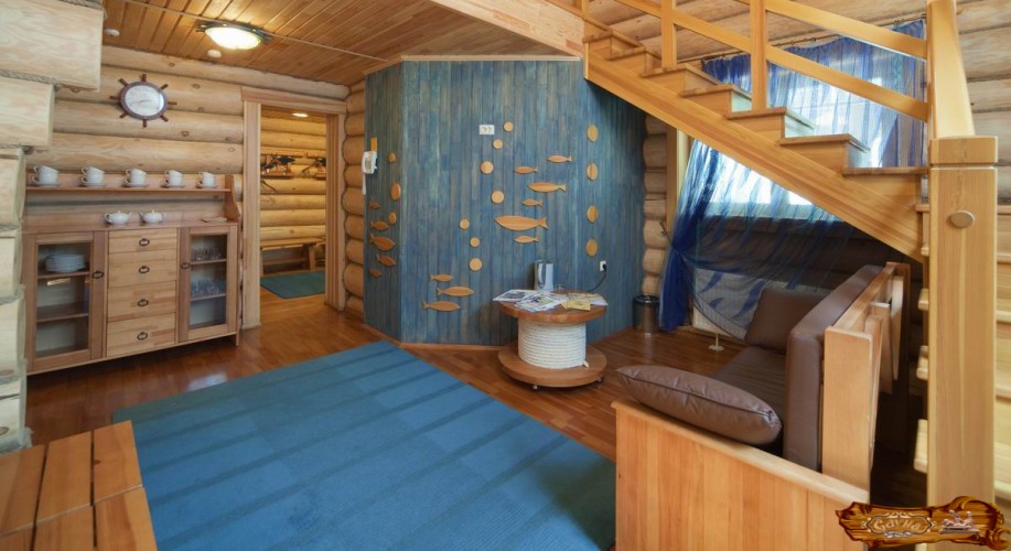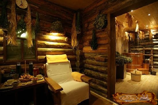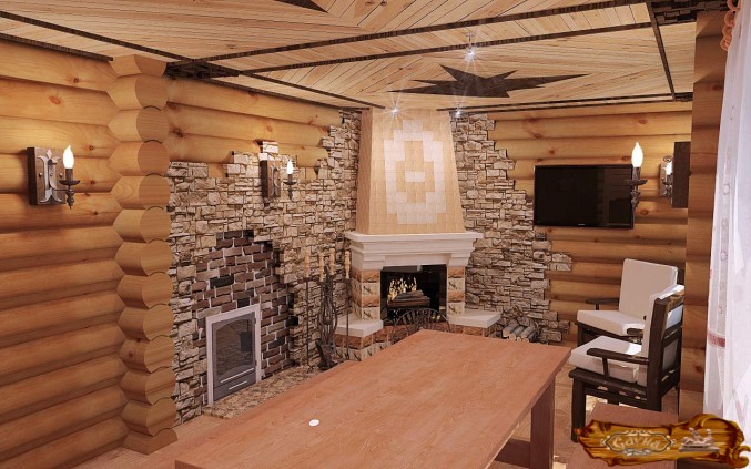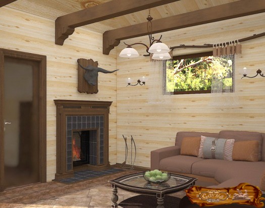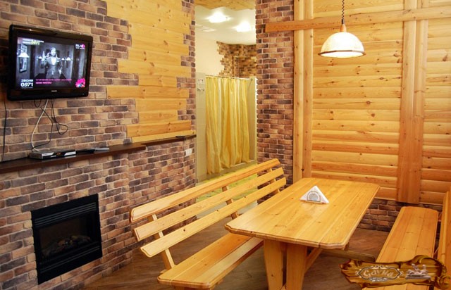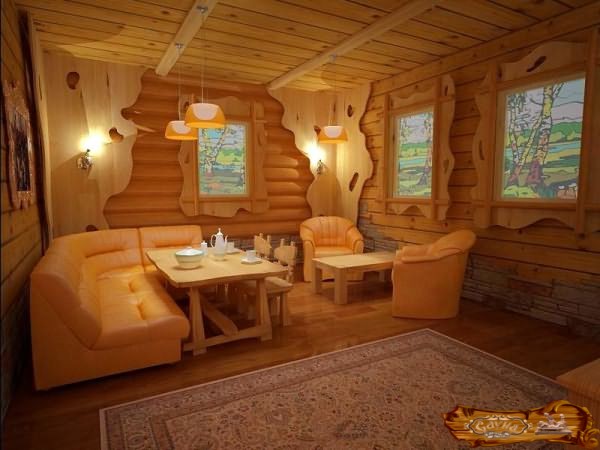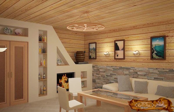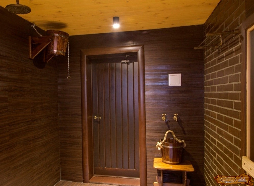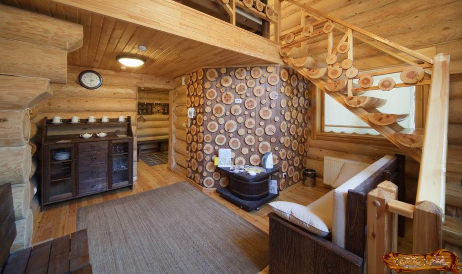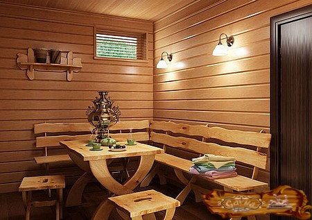 Традиционно отделка выполняется из экологически чистых материалов (будет не очень приятно прийти из парилки в комнату с оформлением из сплошной синтетики).
