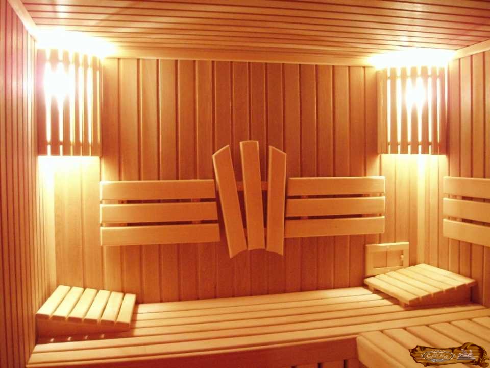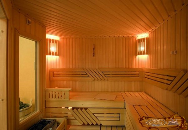 Вот таким оригинальным способом можно выложить деревянную вагонку в парной. В данном примере очень удачно замаскированы светильники: их самих не видно, а свет красиво рассеивается сквозь своеобразные деревянные элементы.