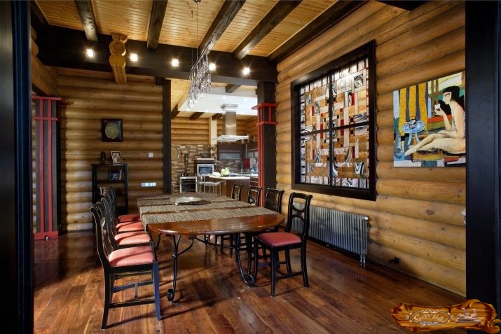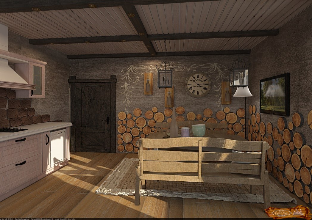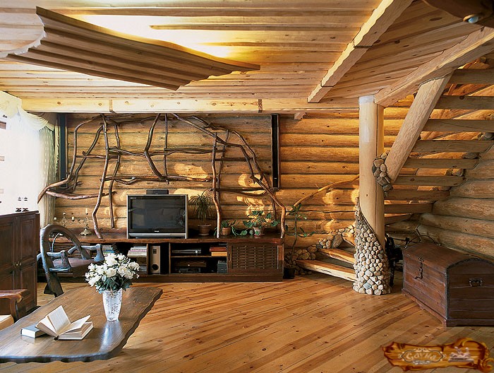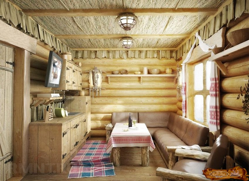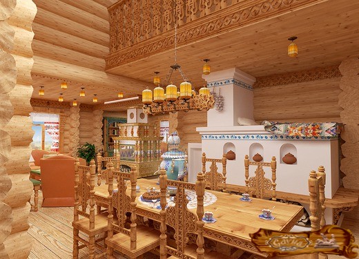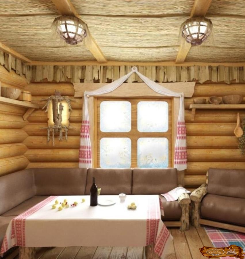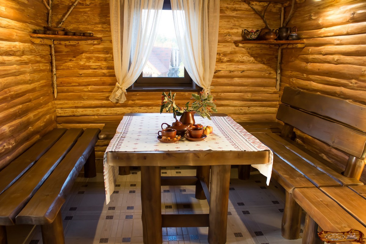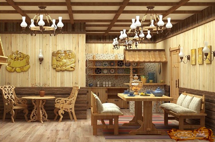 Самым логичным будет декорирование в этническом стиле. Он подразумевает деревянную мебель, кружевные занавески, самовар и другие атрибуты древнерусской культуры.