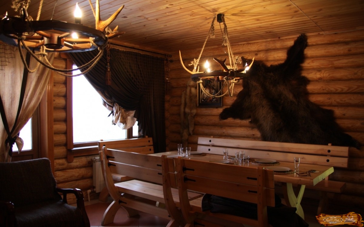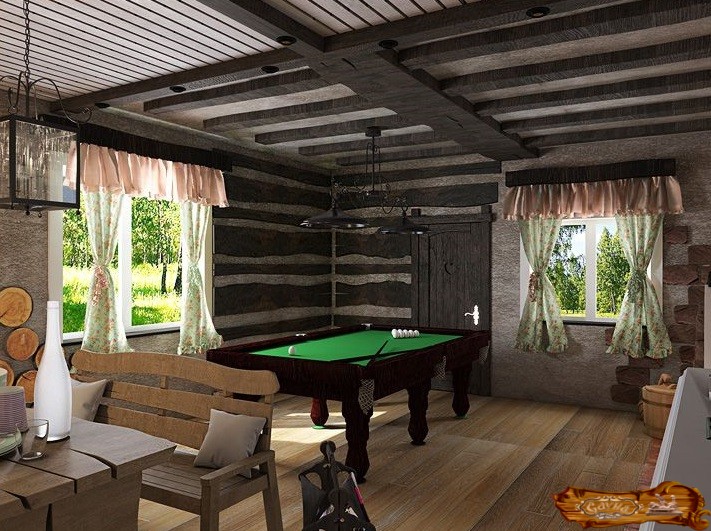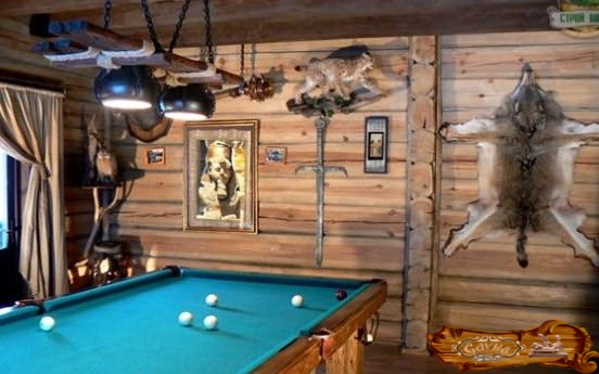 В данном случае дизайн получился весьма брутальным. Шкуры животных, железные элементы и массивный бильярдный стол из дерева создают настоящую «мужскую берлогу», в которой можно часами проводить время с друзьями.