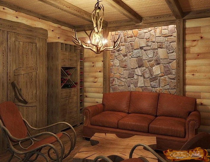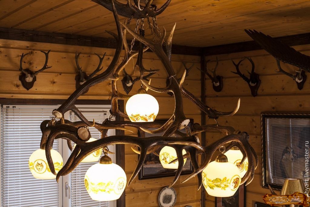 Шикарный элемент декора – люстра-рога. Конечно, для имитации рогов, скорее всего, использовалось обычное дерево, но оно так красиво обработано, что ассоциации приходят сами собой. Такая люстра при не очень мощной лампочке сможет отбрасывать причудливые тени на стены, дополняя атмосферу.
