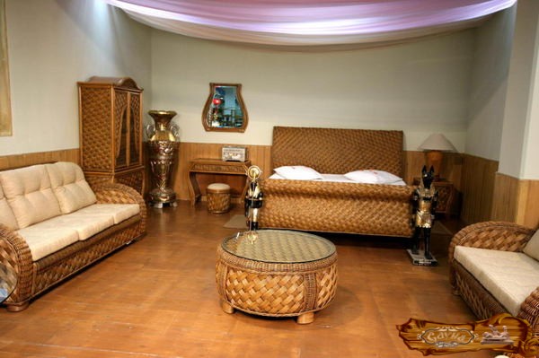 Яркий пример дизайна в экостиле: все элементы выполнены из природных материалов, полотно с этническим орнаментом отлично подходит для штор и скатерти. Каркасы для мебели также сделаны из древесины, близкой к естественной форме.