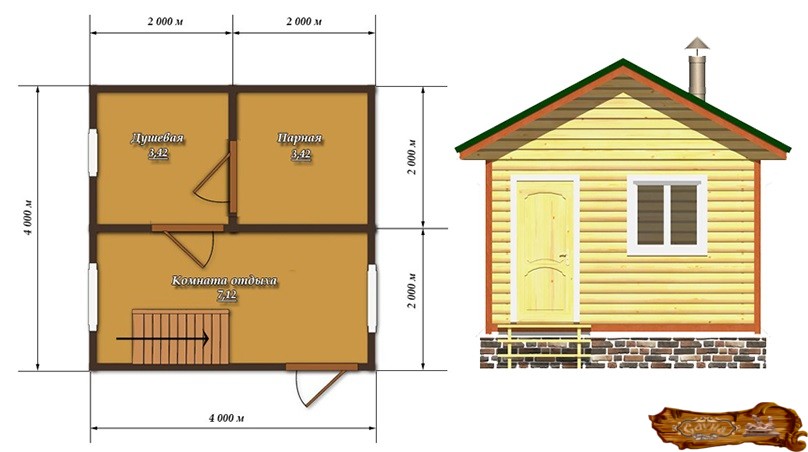 В готовом проекте будущей бани должно быть подробно расписано количество помещений (парилка, душевая комната, предбанник, бассейн и прочее). Типичные проекты бани 3 x 4 предусматривают наличие отдельных комнат для парилки, зоны отдыха и душевой. Для обогрева зачастую используют котел или дровяную печку.