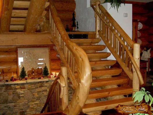 Достопримечательность любой двухэтажной постройки – это лестница. Данный пример показывает шикарную изогнутую конструкцию с коваными перилами. Такие проекты чаще всего делаются на заказ и требуют больших финансовых вложений, но такой элемент способен превратить баню из просто красивой в шикарную.