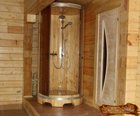 Тут мы видим оригинальное устройство в виде душевой кабины с основанием из дерева. Можно, конечно, очень потрудиться и смастерить что-то подобное самому (или заказать у мастера), но достичь подобного эффекта можно опять же с помощью пленки с рисунком, имитирующим древесный узор. Правда, внутри кабины такая пленка долго не прослужит.