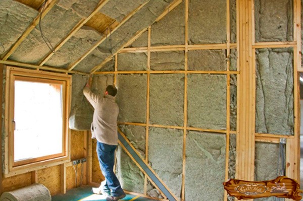Для утепления подойдет минеральная вата, пенопласт или стекловолокно. Толщина материала утеплителя должна быть такой же, как толщина бруса, из которого изготовлен каркас.