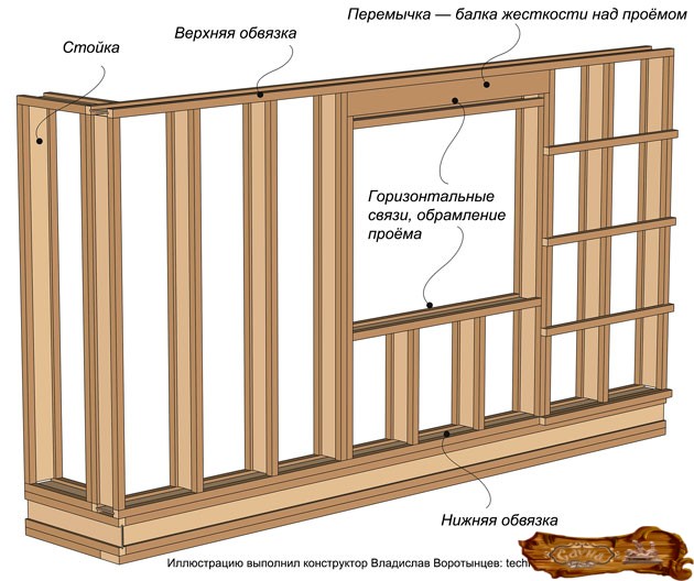 Удобнее всего собрать каркас на свободной территории во дворе. Величина расстояния между стойками зависит от разновидности используемого материала для обшивки. Чтобы листы организовали сплошную стену и их не пришлось подгонять, можно сделать шаг в 60 см. Такая же величина подойдет при монтаже утеплителя, который располагают между стойками.