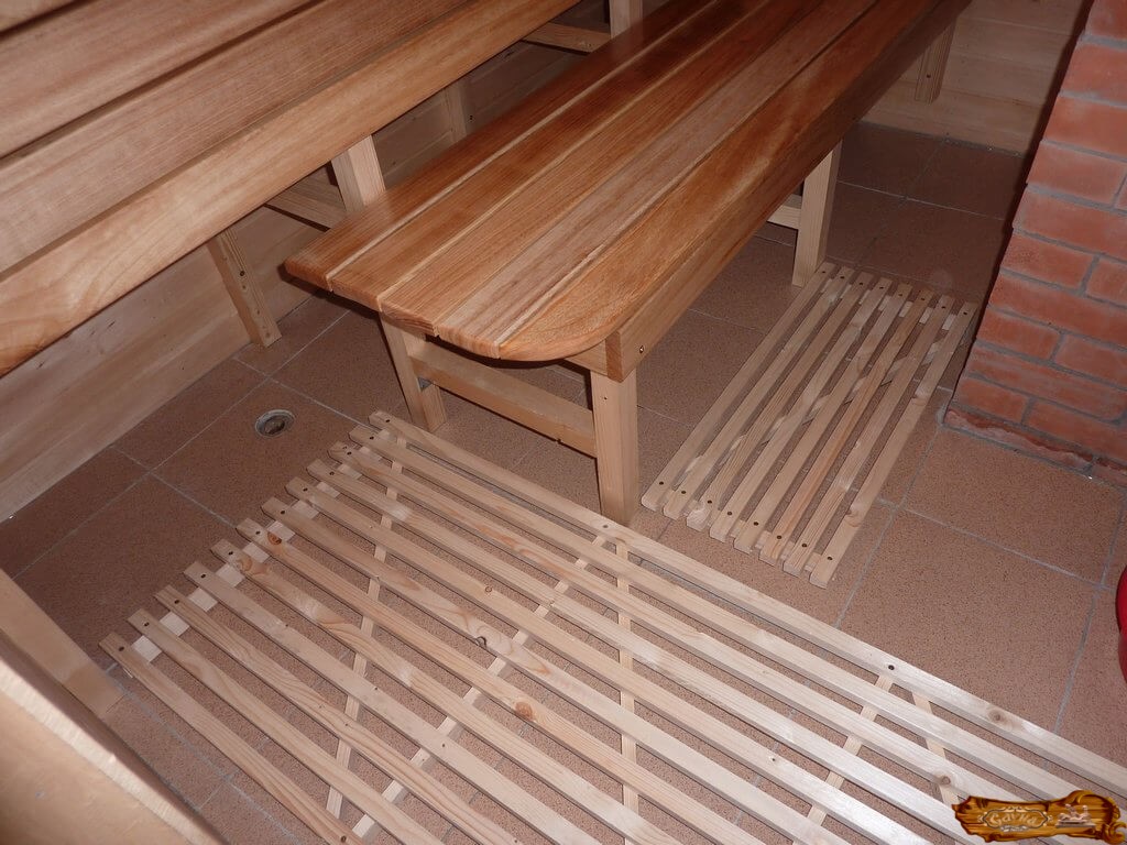 Однако плитка – очень холодный материал, поэтому поверх нее укладывают специальные деревянные решетки, которые после процедур можно снять и просушить.