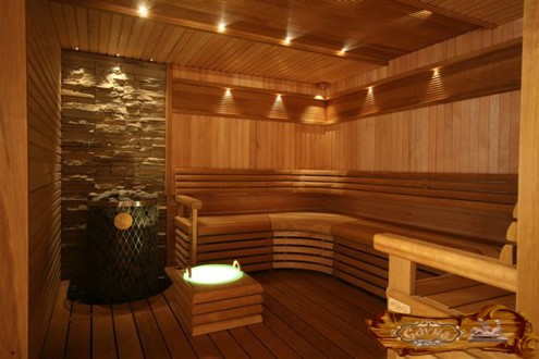 Так как окна в парной небольшие или их совсем нет, то необходимо сделать хорошее искусственное освещение. Если его правильно установить, то можно создать такую атмосферу в парилке, которая будет располагать собеседника к душевным разговорам. Освещение не должно быть очень ярким, предпочтительным является полумрак. Подойдут теплые приглушенные оттенки, которые только подчеркнут спокойную атмосферу.