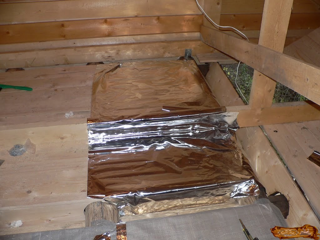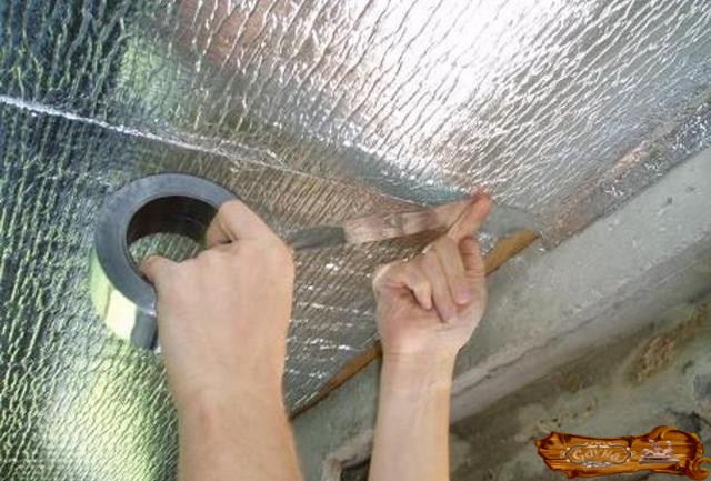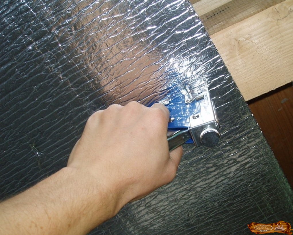 Если парилка деревянная, тогда ее потолок делается по потолочной конструкции балок. Поверх них ложится гидроизоляционная пленка, имеющая толщину два миллиметра. Ее полосы должны идти внахлест, прикрепляясь между собой лентой-самоклейкой, а к балкам – скобами – с помощью строительного степлера.