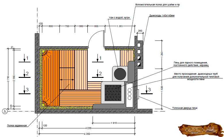 Немаловажным является количества людей, одновременно находящихся в парной. Согласно неписаным нормативам, на одного человека нужно приблизительно 0,70 метра площади. Также нужно учесть рост самого высокого члена семьи, добавив к нему двадцать сантиметров. При расчетах проекта не стоит забывать о том, что утепление парилки заберет пару сантиметров пространства, а если сделать помещение чересчур высоким, тогда тепло будет расходоваться понапрасну.