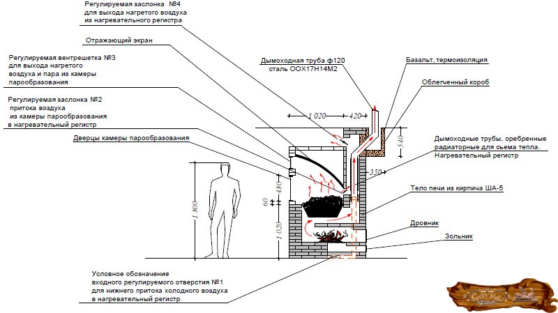Выбрав такой отопительный прибор, необходимо знать, что для его установки обязательно нужен фундамент. Размеры печи можно подобрать, исходя из особенностей помещения парилки и ее габаритов. Установка именно кирпичной печки хороша тем, что, в отличие от металлических печей, изделия из кирпича нагреваются медленно и остывают не очень быстро. После установки такой печи, воздух в парной будет легким и сухим, к тому же прикасаясь к ней, практически нельзя обжечься. Поэтому ее можно установить, поближе к полкам, чтобы было тепло долгое время.