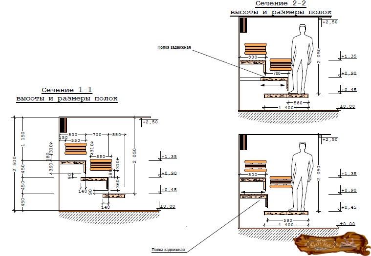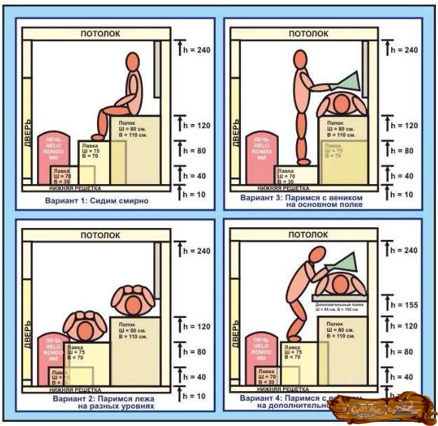 Оптимальная высота парилки – это два метра двадцать сантиметров.