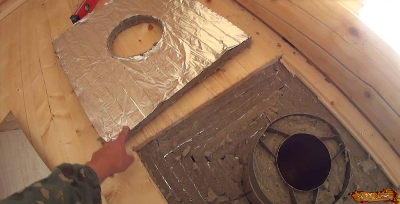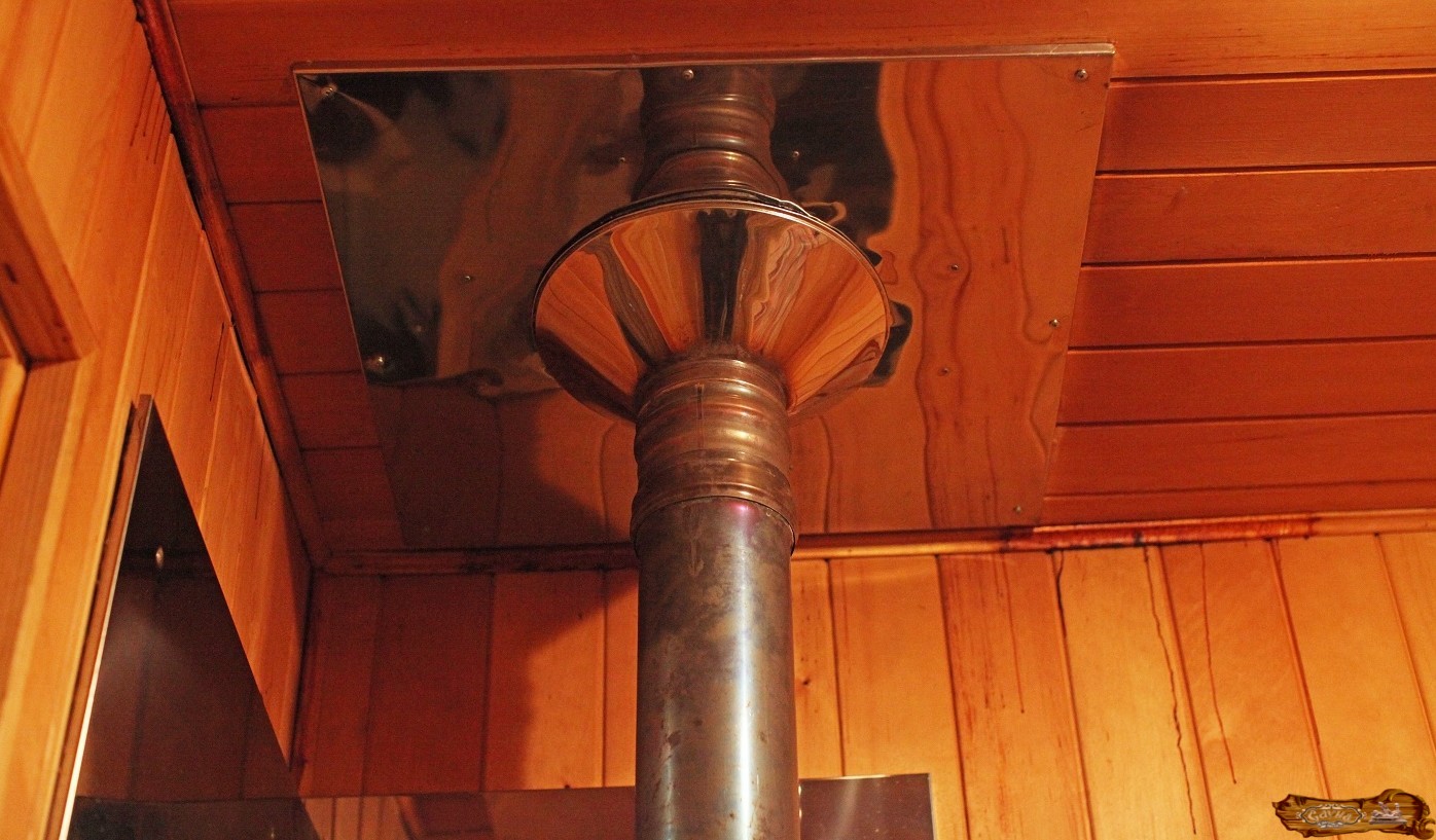 Далее в проеме на потолке закрепляется большой лист из металла. Это нужно, чтобы сделать выход для одного из самых важных элементов – дымохода. В металле надо заранее сделать дырку для трубы. На печку устанавливается бак с водой. И через специально сделанный проем наверх выводится труба, заизолированная любыми негорючими материалами.