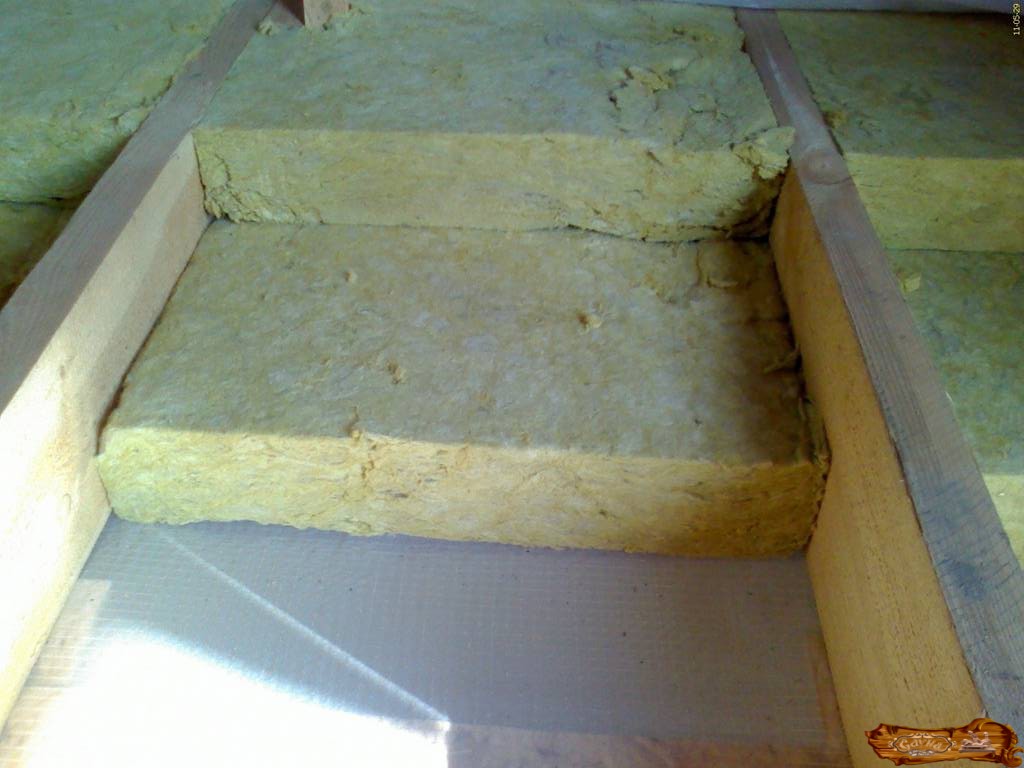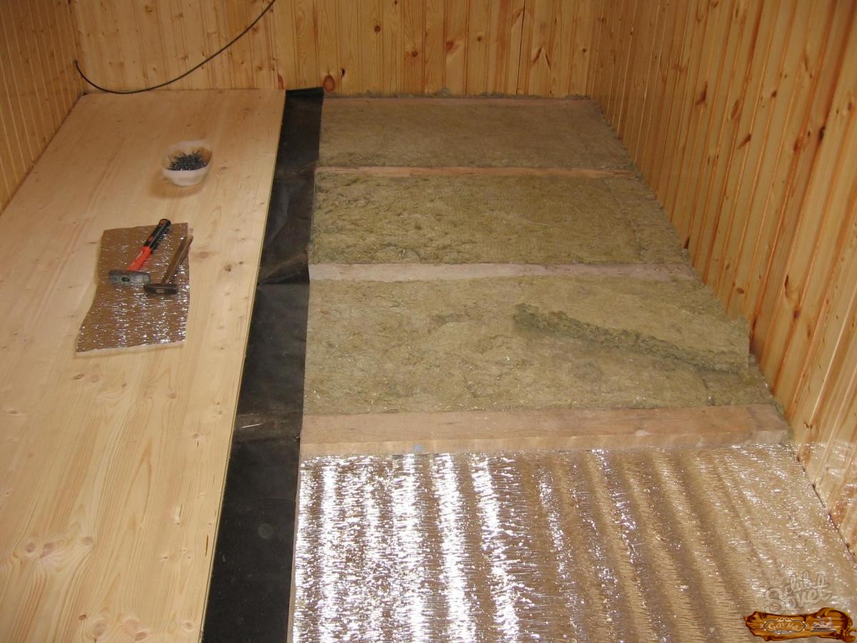 Сверху гидроизоляционной ленты ложатся листы из влагостойкой фанеры, которые стыкуются по балкам. Далее – доски толщиной сорок миллиметров, которые необходимо стыковать очень точно. Следующий этап утепления происходит внутри парилки. Для этого между балками нужно уложить утеплитель в таком порядке, чтобы он был внатяжку с элементами потолка. Это делает невозможным попадание холода вовнутрь.