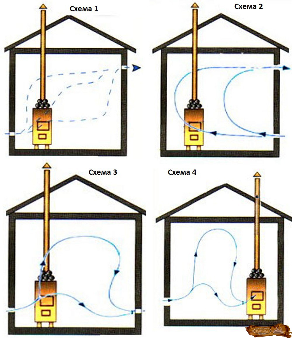 Вытяжные трубы делаются поближе к потолку, чтобы угарный газ и увлажненный горячий воздух выходил через них.
