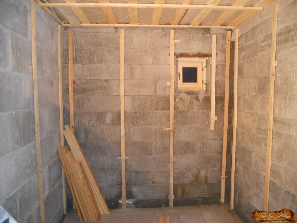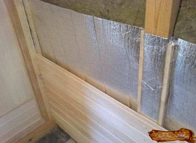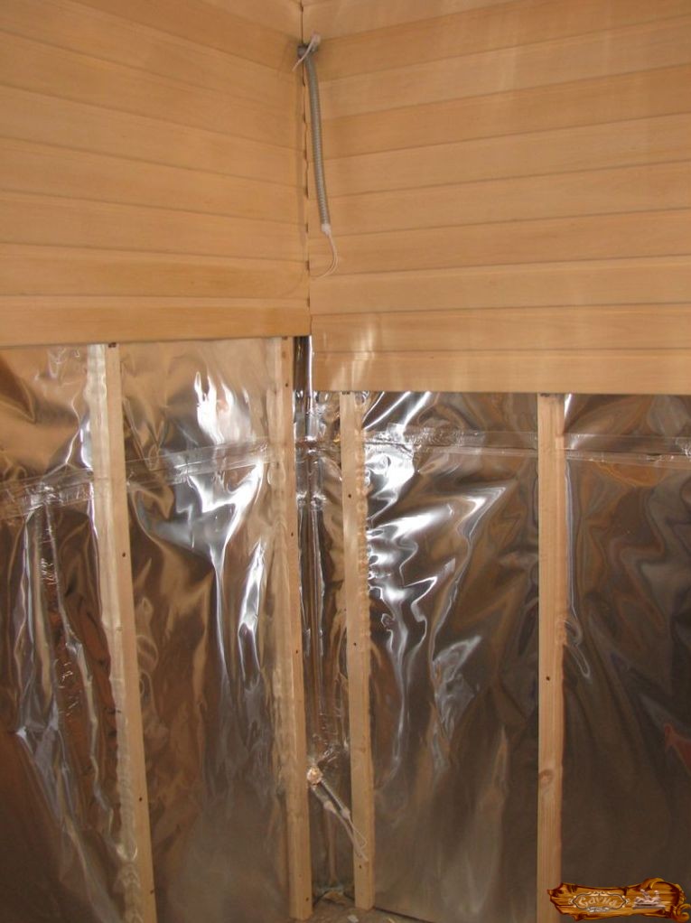После этого делается утепление стен или же так называемый «пирог» в парной, состоящий из нескольких элементов. Это стенка, оббитая деревянными брусьями, теплоизолятор, находящийся между ними, пароизолятор, а также сконструированная из реек обрешетка.