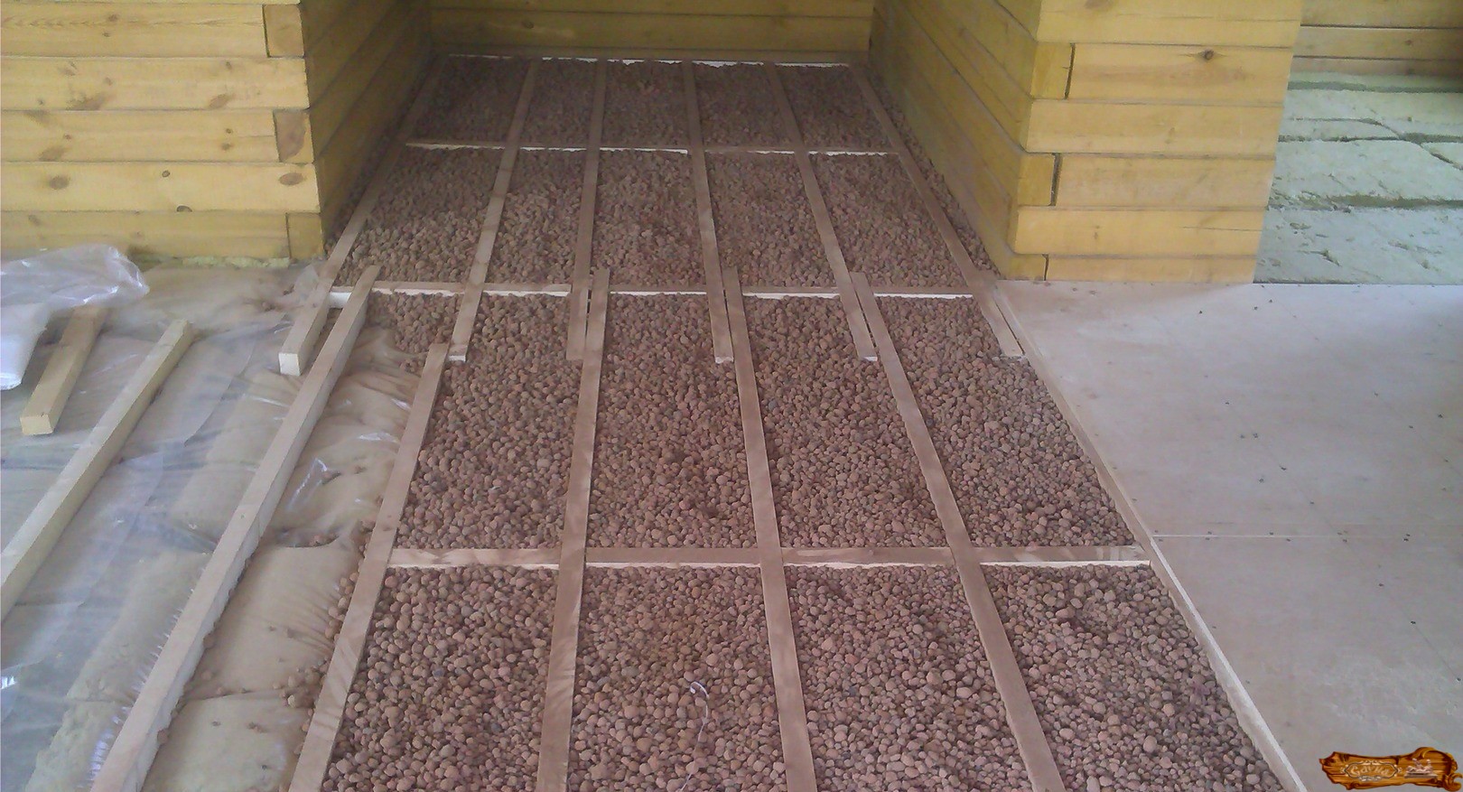 Чтобы утеплить бетонный пол, нужна совсем другая технология. Сначала выравнивается грунт, для чего поочередно засыпается песок, щебень и гравий. А затем все это плотно трамбуется. Следующим этапом будет укладка каркаса из металлической сетки, и только потом кладется слой гидроизоляционной пленки.