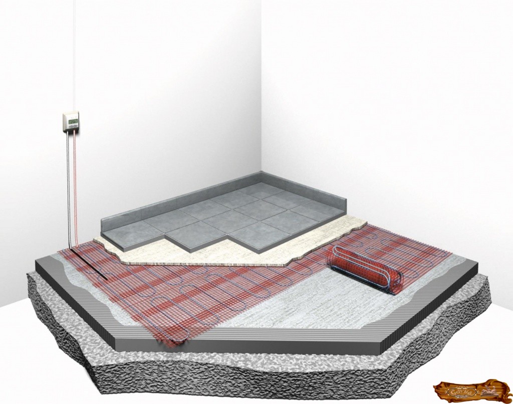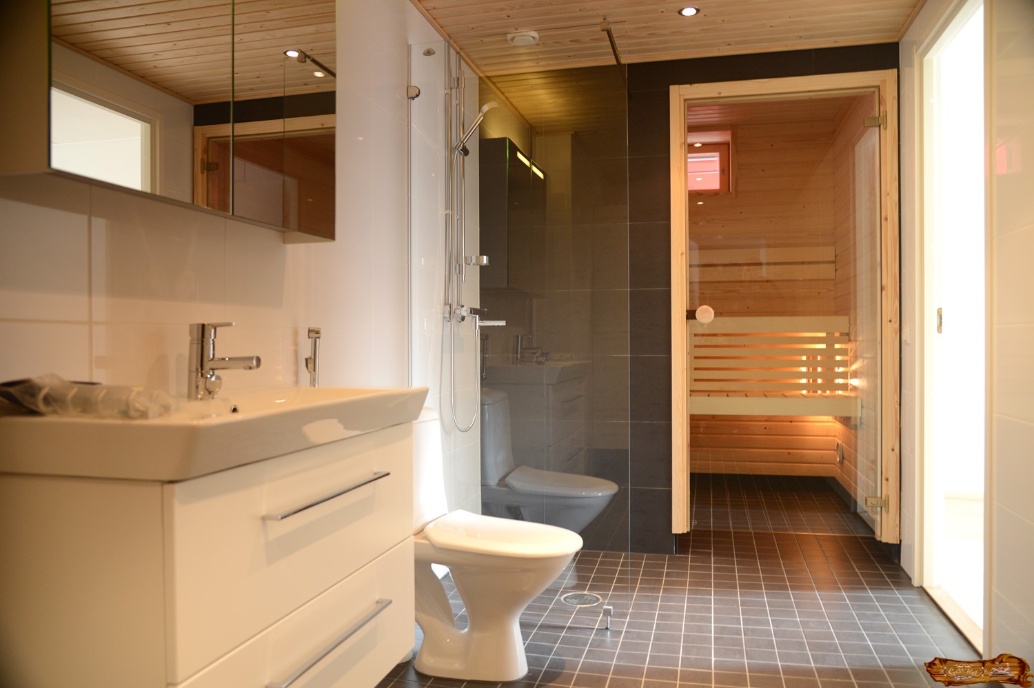 Схема обустройства пола тоже отличается от других помещений. Внизу бетонное основание и слой пенополистирола, затем плавающая стяжка, проложенная наплавляемой гидроизоляцией. В качестве финишной отделки хорошо работает керамическая или каменная плитка. При желании можно установить систему теплых полов. На плитку кладут деревянную решетку.