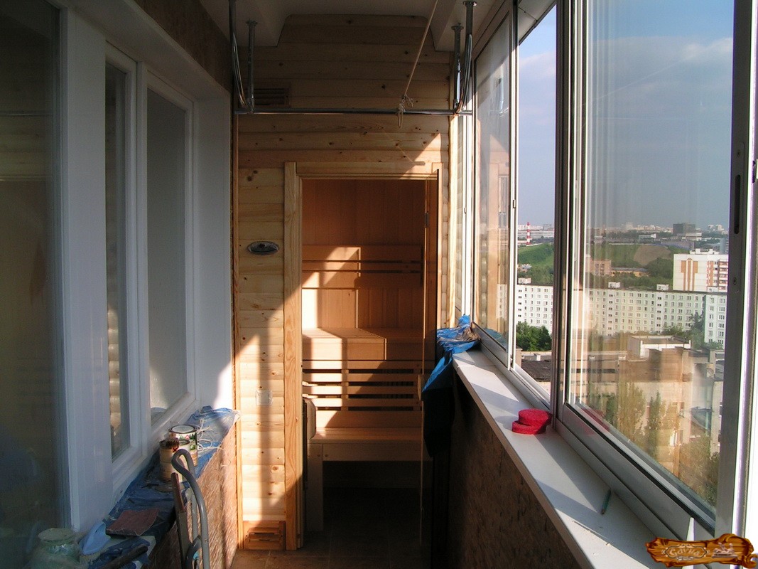 На просторной лоджии или застекленном балконе получится прекрасная баня, нужно только как следует утеплить балкон. Вентиляцию можно вывести прямо на улицу.