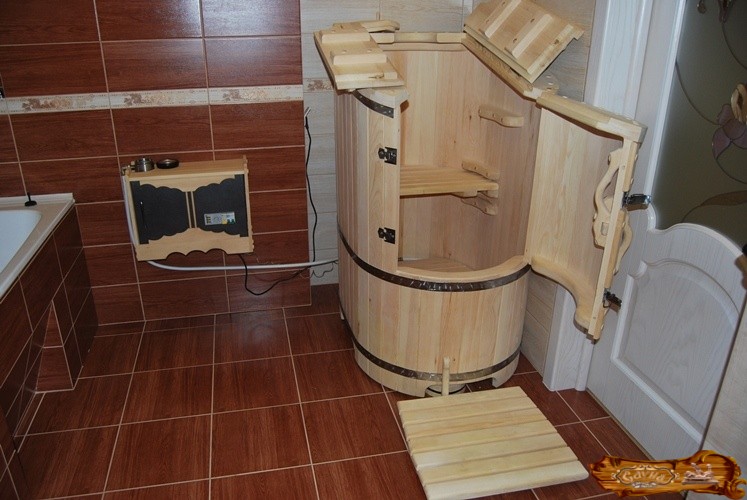 Размещается домашняя переносная или складная кабинка в любом подходящем помещении дома или квартиры. Наиболее удобна для этого ванная комната, потому что она уже имеет гидро- и пароизоляционные слои, водостойкую отделку. В ванной уже подведены все необходимые коммуникации, не потребуется делать перепланировку, производить согласование.
