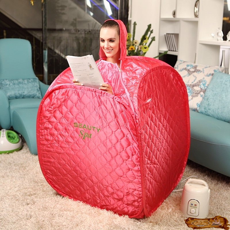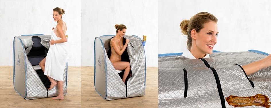 Складная портативная сауна из специальной многослойной ткани продается в компактной упаковке, весит совсем немного, работает от сети. Ткань пропускает немного тепла наружу, поэтому потребляет довольно много электроэнергии. В разложенном виде парилка из ткани выглядит как палатка, человек садится внутрь нее, голова остается снаружи. Затем следует застегнуть молнию и можно начинать банные процедуры. Раскладывать эту баню можно в любом помещении даже в однокомнатной квартире.
