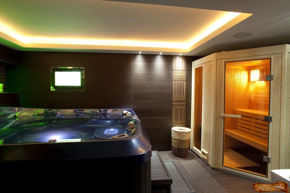 Современный авангардный интерьер подразумевает соответствующий стиль бани. Кабина из закаленного стекла соседствует с душевой кабиной и оснащена самыми современными опциями для банных процедур и спа. Она сверкает хромированными деталями и гармонично вписывается в стиль хай-тек. Прекрасно смотрятся в отделке стеклоблоки, создавая интересные световые эффекты.