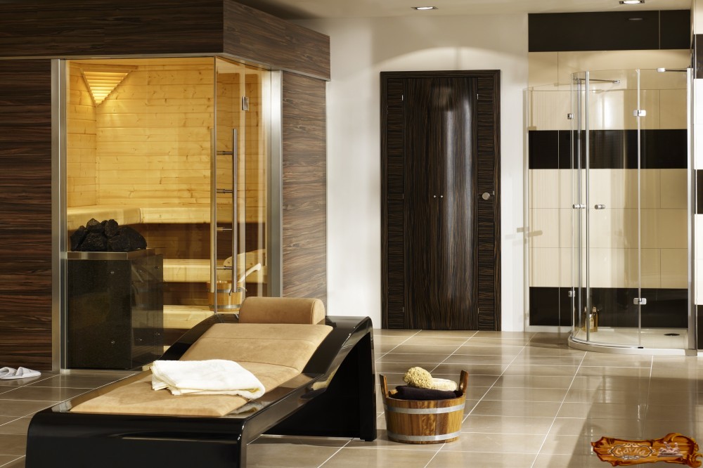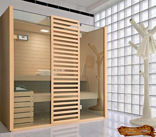 Двери в сауну могут быть выполнены полностью из дерева, включая ручки, а могут быть из закаленного толстого стекла. Они бывают распашными или раздвижными. Ширина проема должна равняться 60 см. Полки для сидения или лежания устраивают в два-три ряда, для удобства уборки их делают съемными. Ширина полок равна примерно 35-55 см.