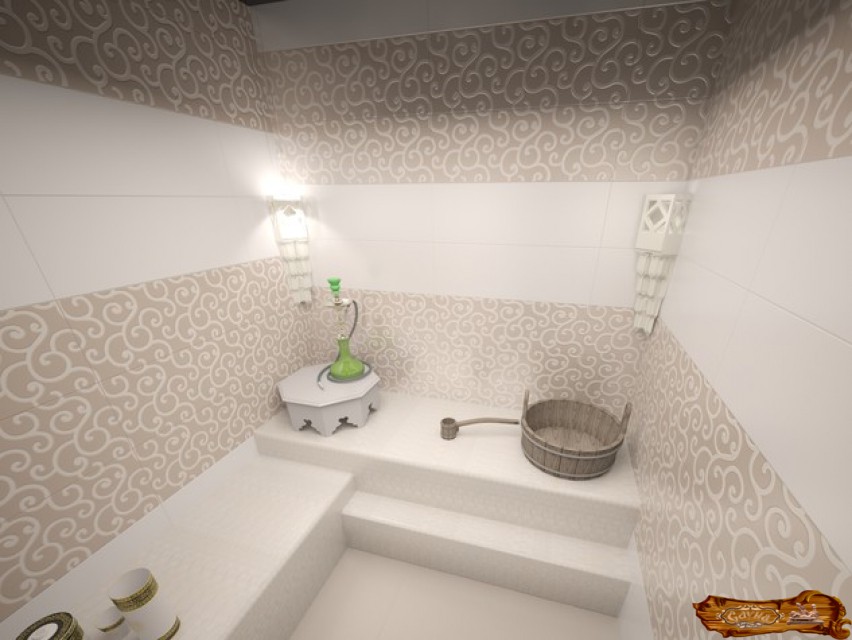 В хаммаме пол, стены и потолок облицовывают мрамором, а если нужен более бюджетный вариант, то выкладывают мозаичной плиткой или обычной керамической. Мозаика имеет огромное разнообразие рисунков и оттенков. Можно сделать орнамент в восточном стиле, выложив картину, либо отдать предпочтение натуральности каменной плитки.