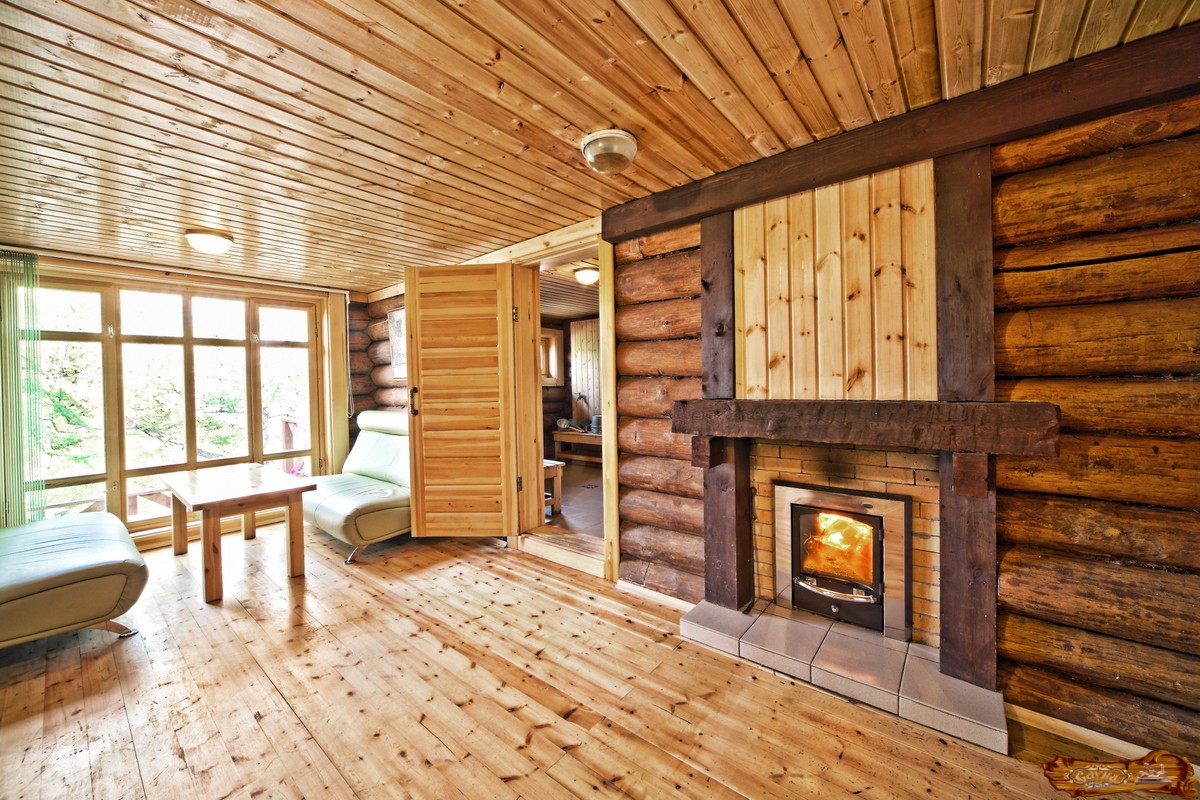 Пол в комнате отдыха обычно делают деревянным. Если выложить его плиткой, ходить босиком будет холодно, а линолеум и ламинат могут повреждаться в условиях высокой влажности. Ковровые покрытия по причине влажности также не принято использовать. При этом если у вас просторная комната отдыха, в которой вы можете выделить отдельную зону кухни, в данной части помещения можно выложить пол плиткой, которая будет сочетаться с деревом.