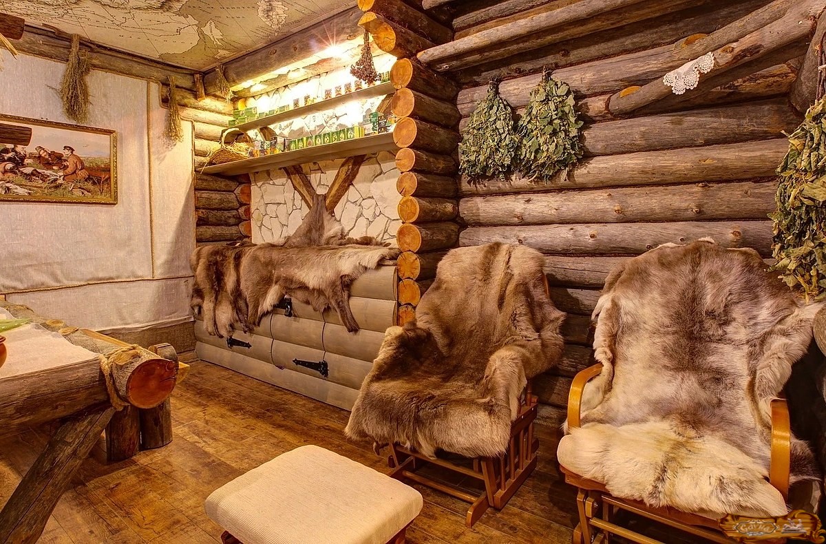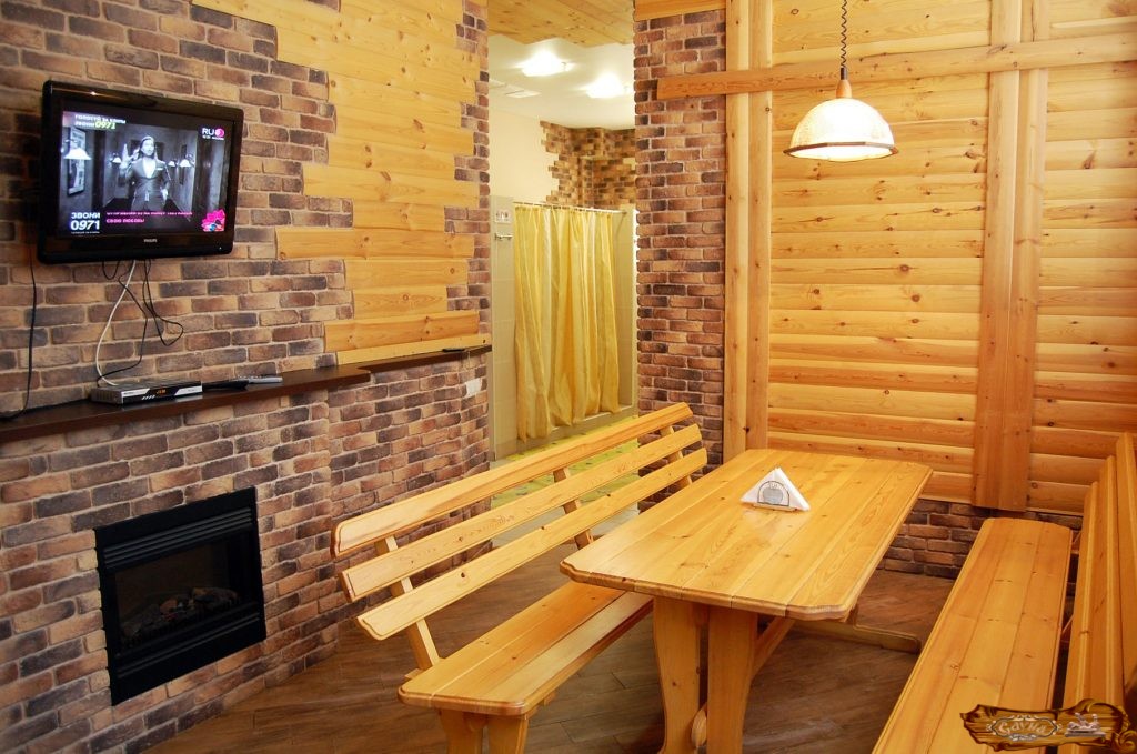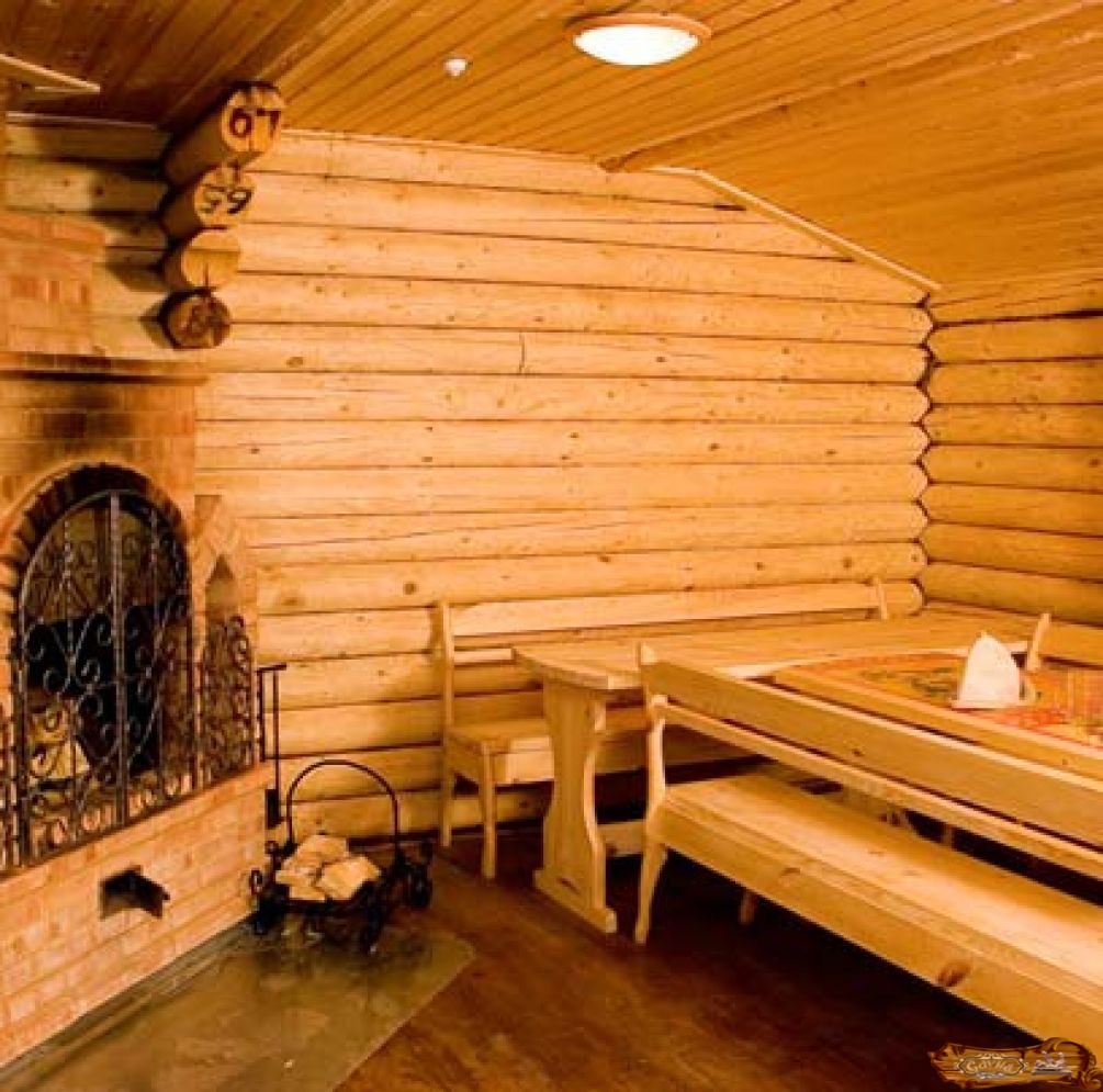 Нередко комнату отдыха также полностью отделывают деревом. Обычно такой вариант отделки отлично сочетается с парилкой. Деревянные брусья на стенах помогают создать в бане неповторимую и особенную атмосферу, насладиться качеством экологичных материалов и ощутить полное единение с природой.