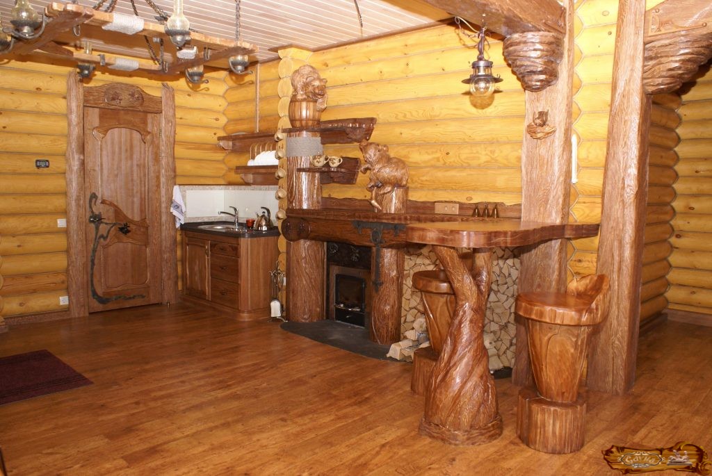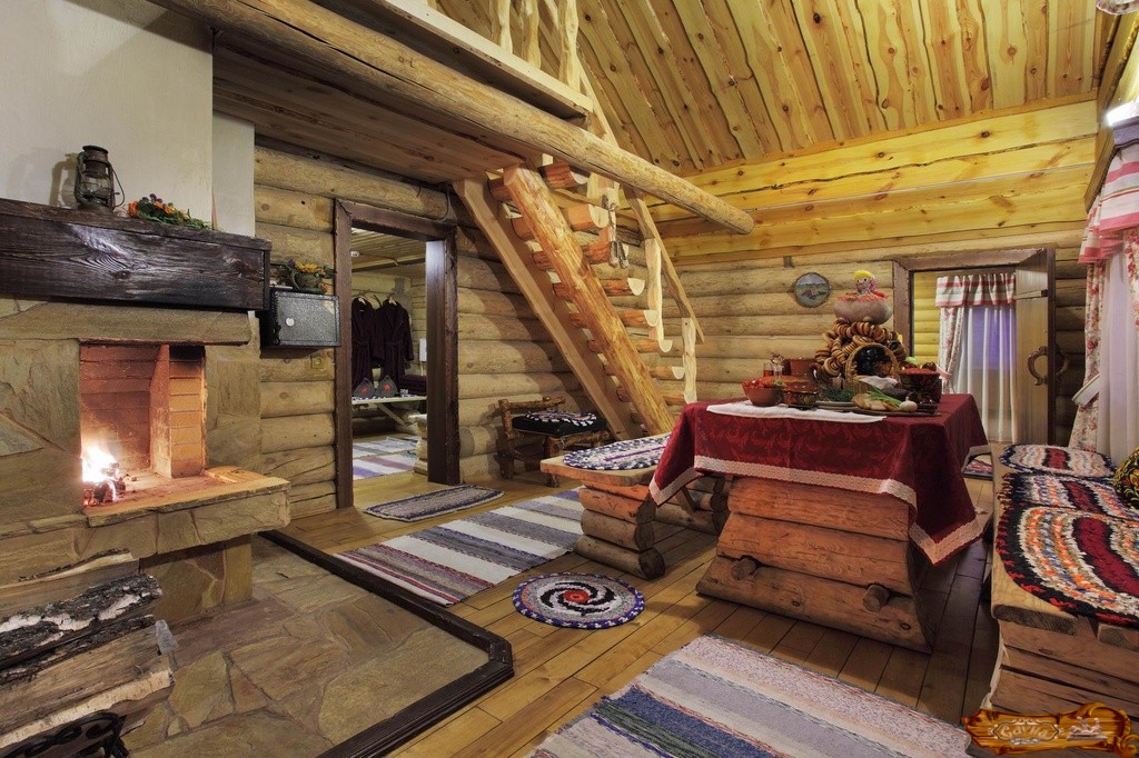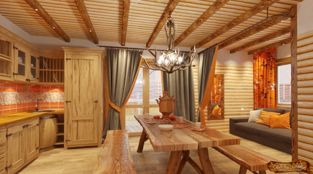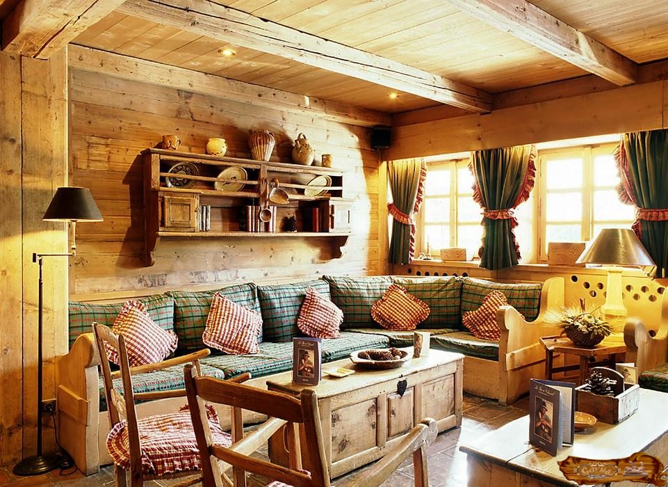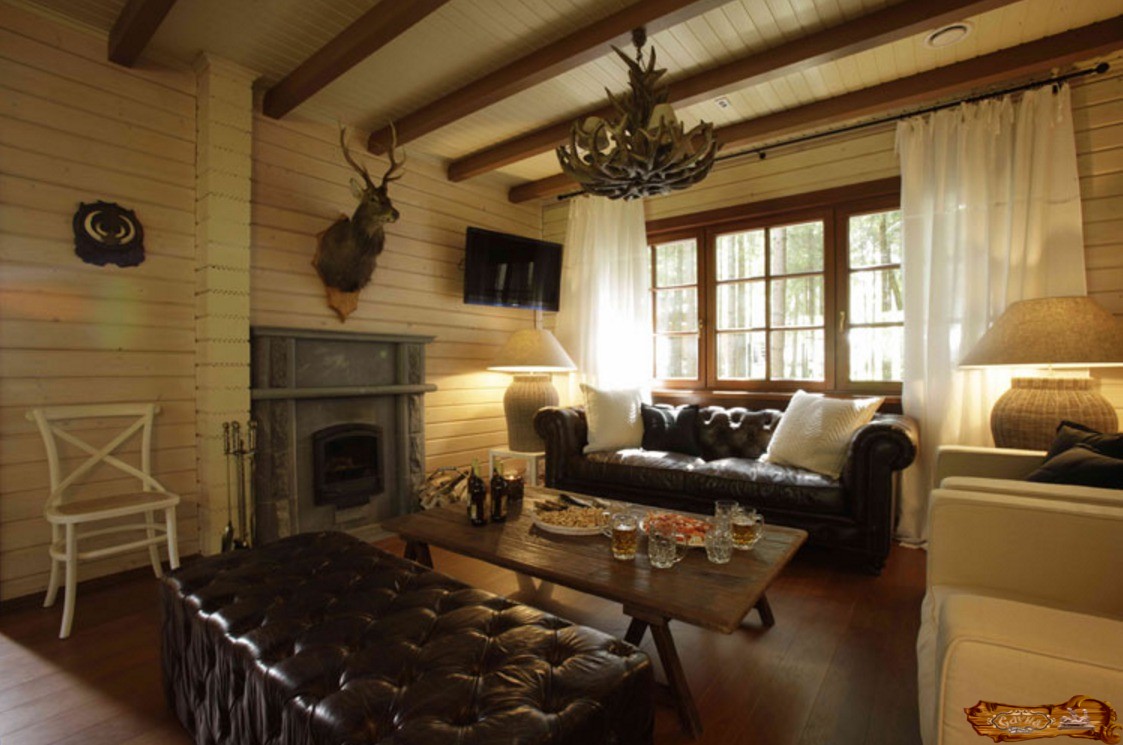 В комнате отдыха обычно есть окна, поэтому вам потребуются шторы или жалюзи. Большой популярностью пользуются деревянные варианты из бамбука. Стоит также выбрать кухонную утварь на ваше усмотрение, это может быть керамическая или деревянная посуда. Стены можно украсить картинами, гобеленами, шкурами животных или чучелами. Также хорошо могут смотреться пуфики и тумбы из натуральной кожи.