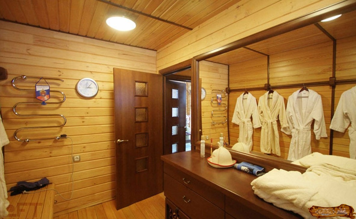Предбанник можно украсить по своему усмотрению. Там органично могут смотреться картины, небольшой коврик, миниатюрный столик, часы и крючки для одежды. Все эти мелкие детали позволят сделать стильным и неповторимым даже самый простой интерьер бани.