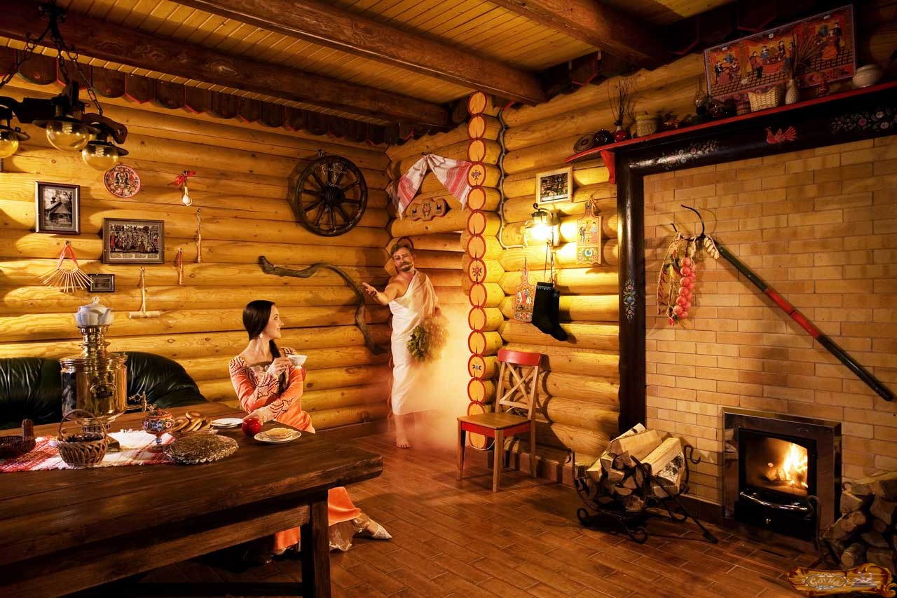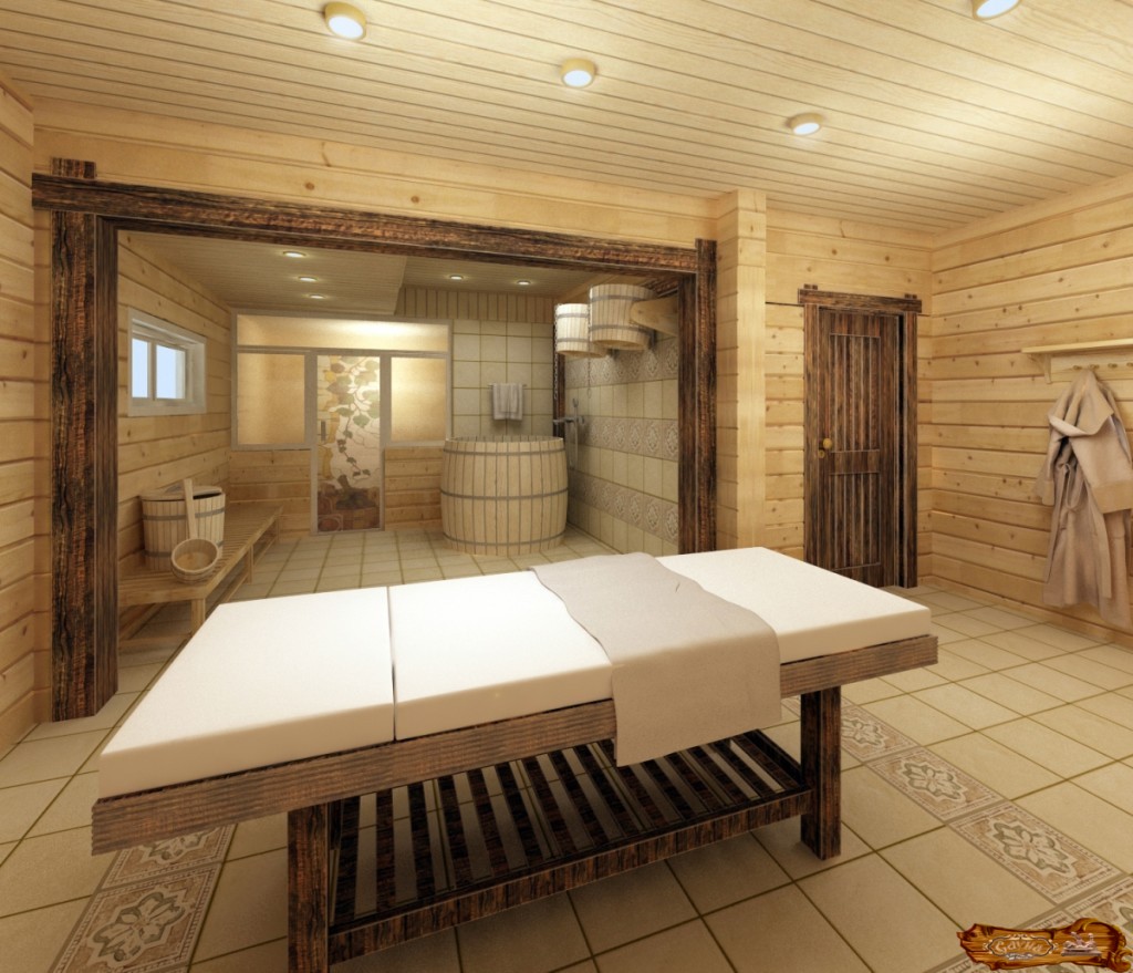 Очень интересно могут смотреться комнаты отдыха в стиле кантри. Деревянные балки на потолке, отделка стен брусом и простая мебель будет гармонично сочетаться с традиционным дизайном парилки. Чтобы сделать такой интерьер оригинальным, можно декорировать окна или двери витражным стеклом, а также сочетать темную и светлую древесину.