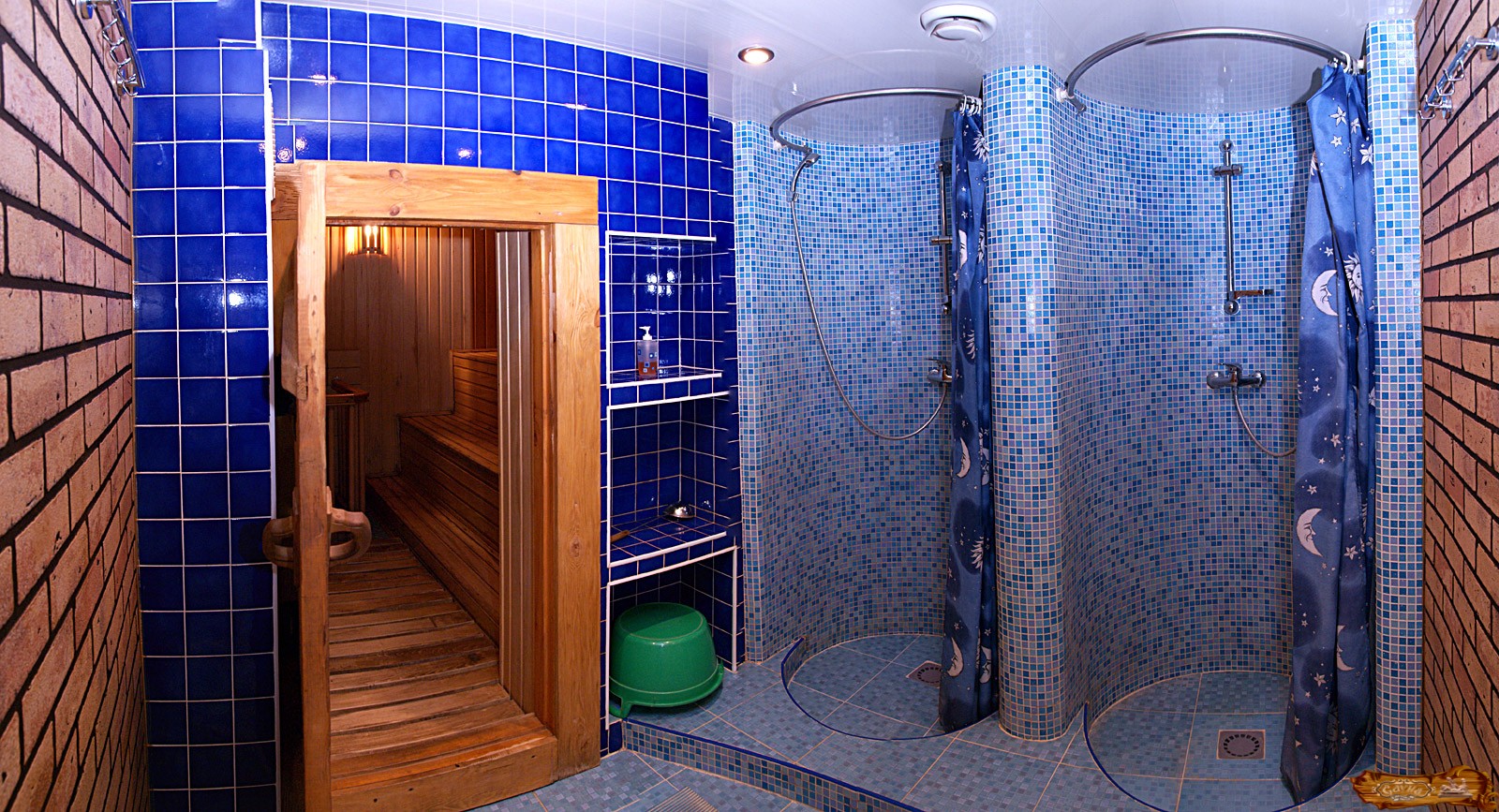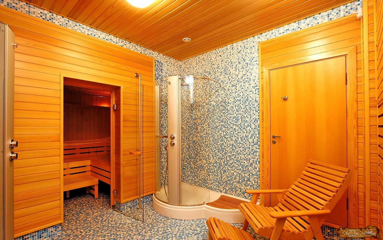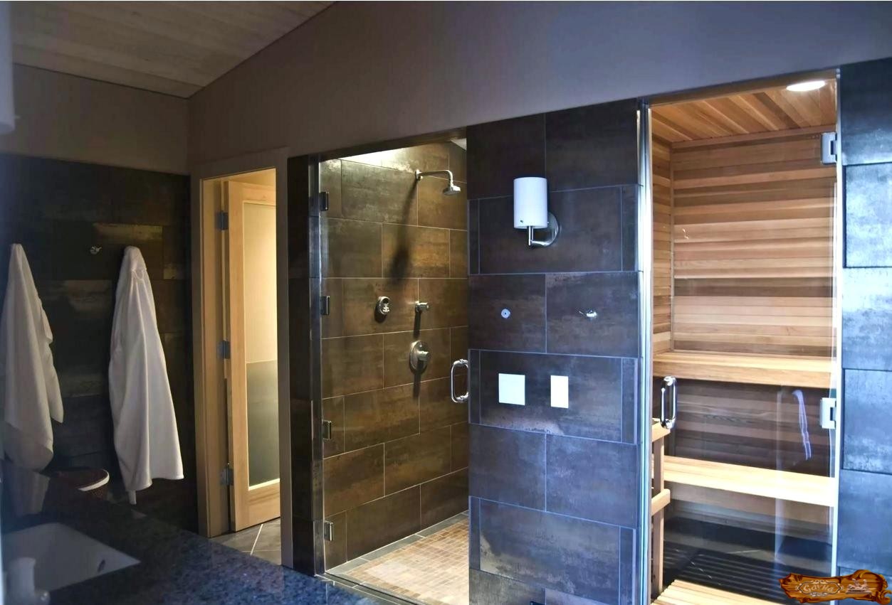 Декор душевой комнаты в бане может напоминать отделку ванной в доме или квартире.