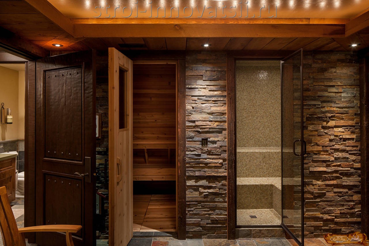 Каменная отделка также может оказаться удачной для душевой кабины. Такой простой и стильный дизайн отлично будет сочетаться с оформлением всей бани в традиционном стиле. Преимущественно для такого декора выбирают всевозможную плитку с особой фактурой, которая напоминает камень.