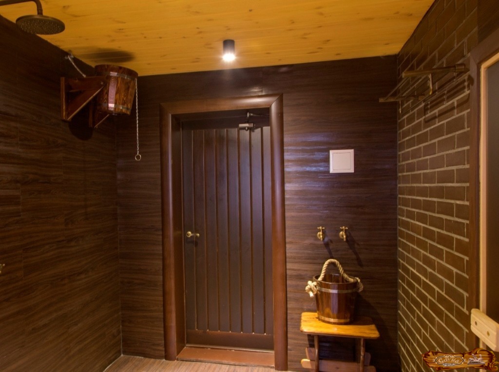 Что касается освещения, для бани обычно выбирают встроенные в потолок лампы, которые будут максимально незаметными. Также иногда вешают дополнительные светильники по стенам. Такие варианты освещения характерны для предбанника, парилки и душевой комнаты. Броские люстры практически не используются, уместны они могут быть разве что в комнате отдыха, оформленной в современном стиле.