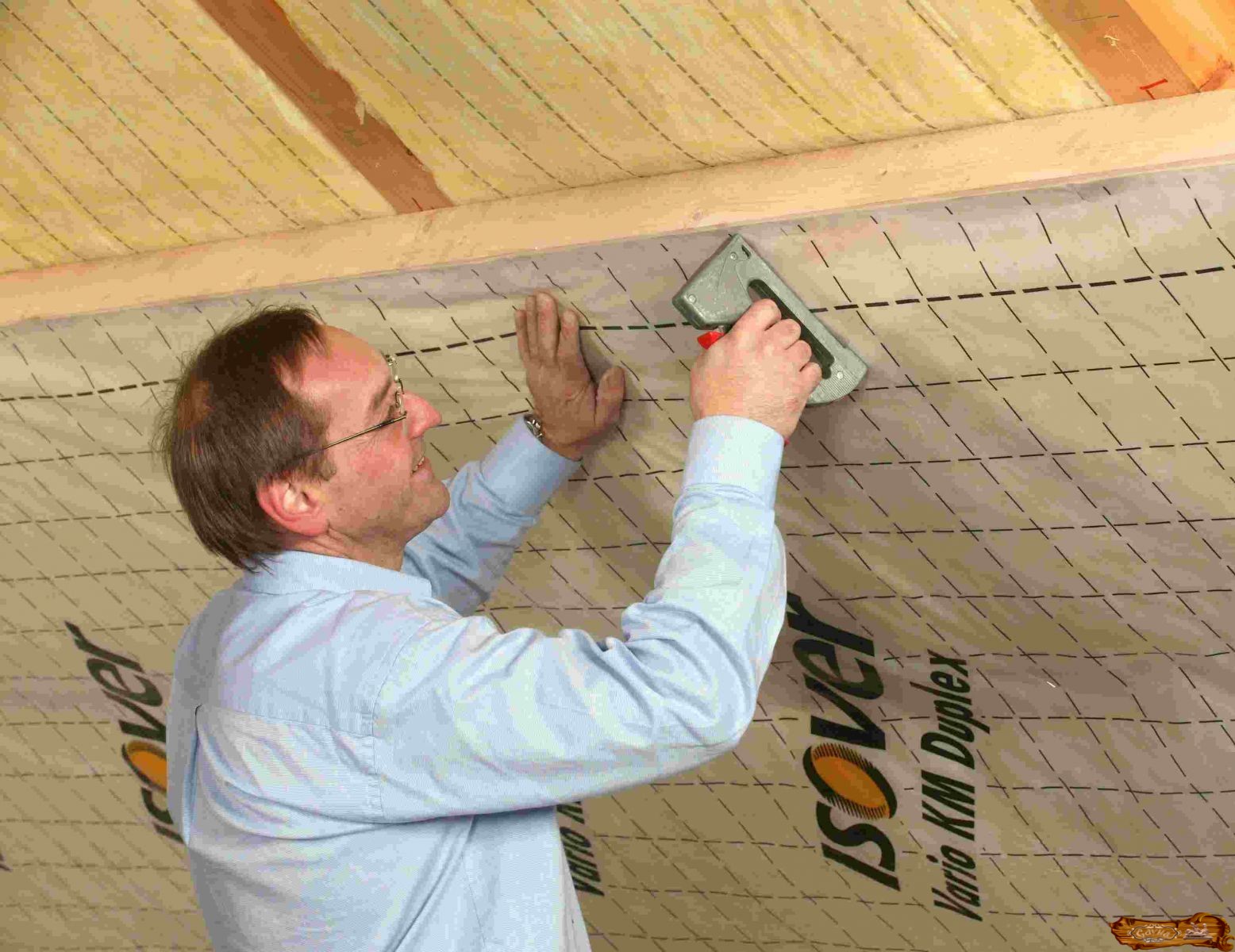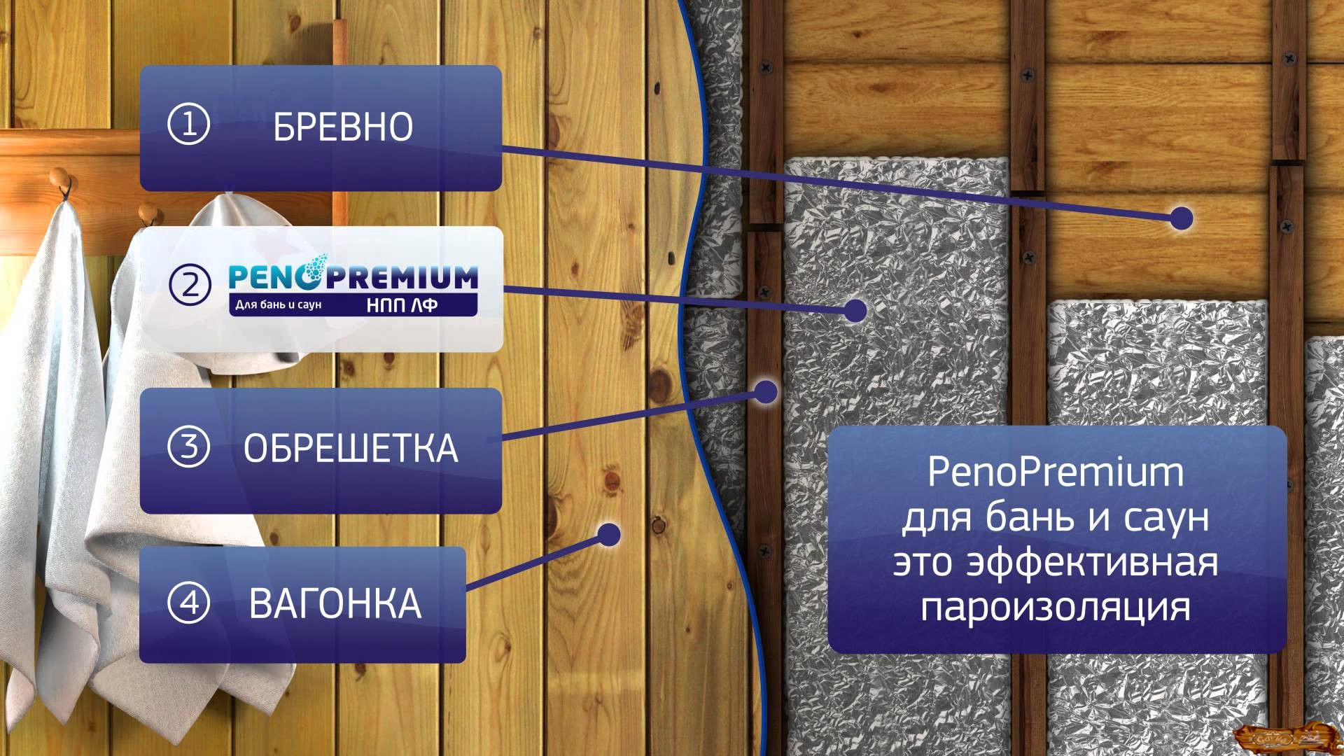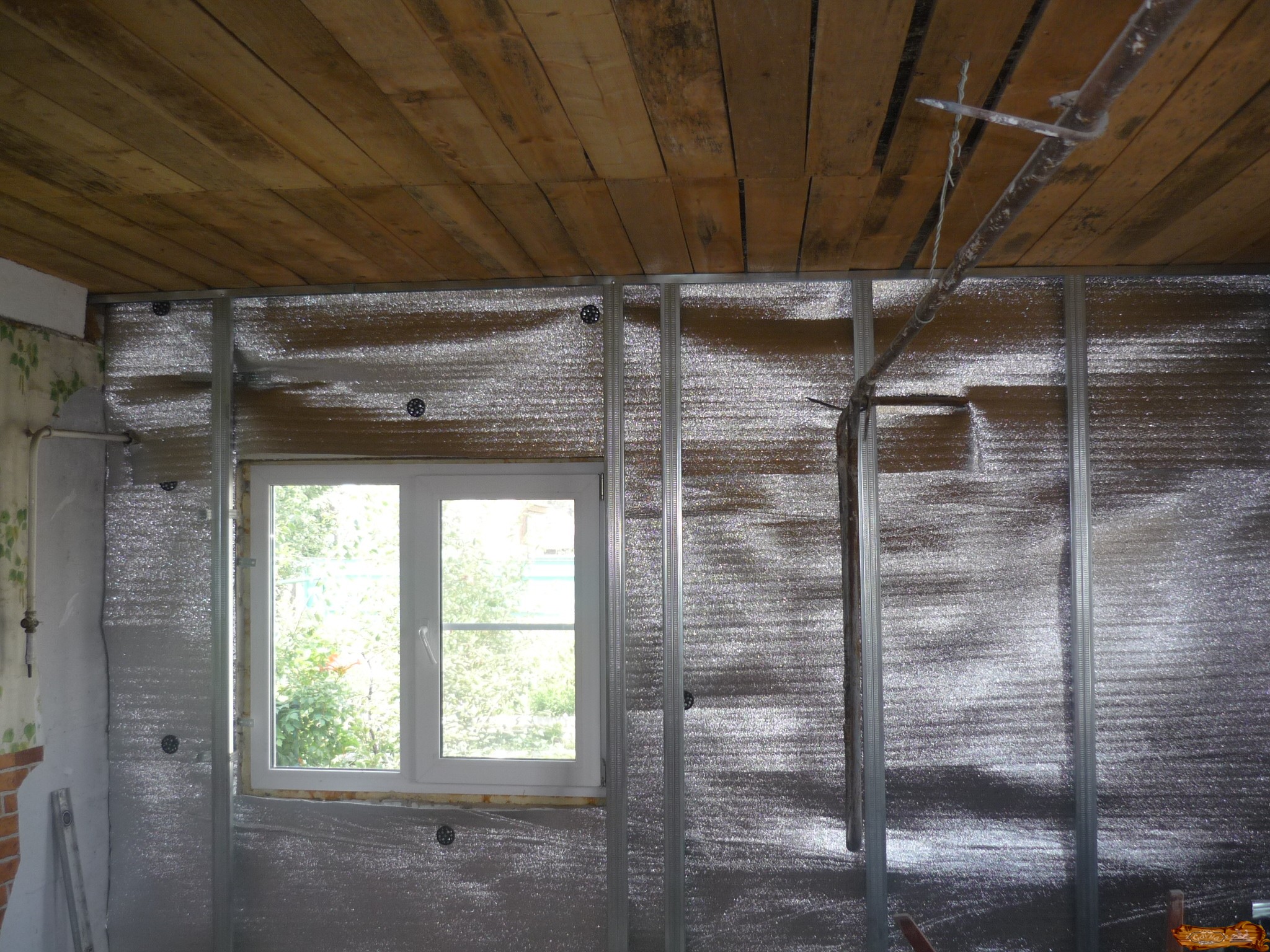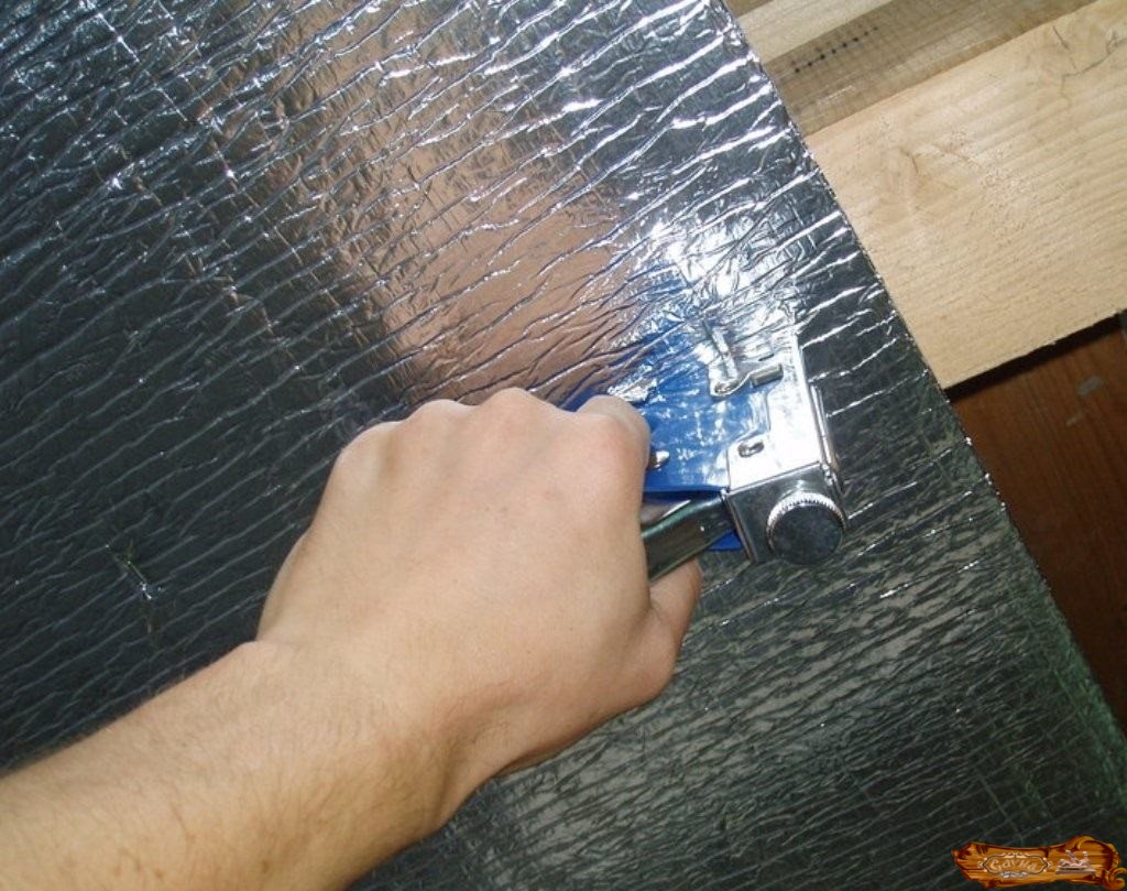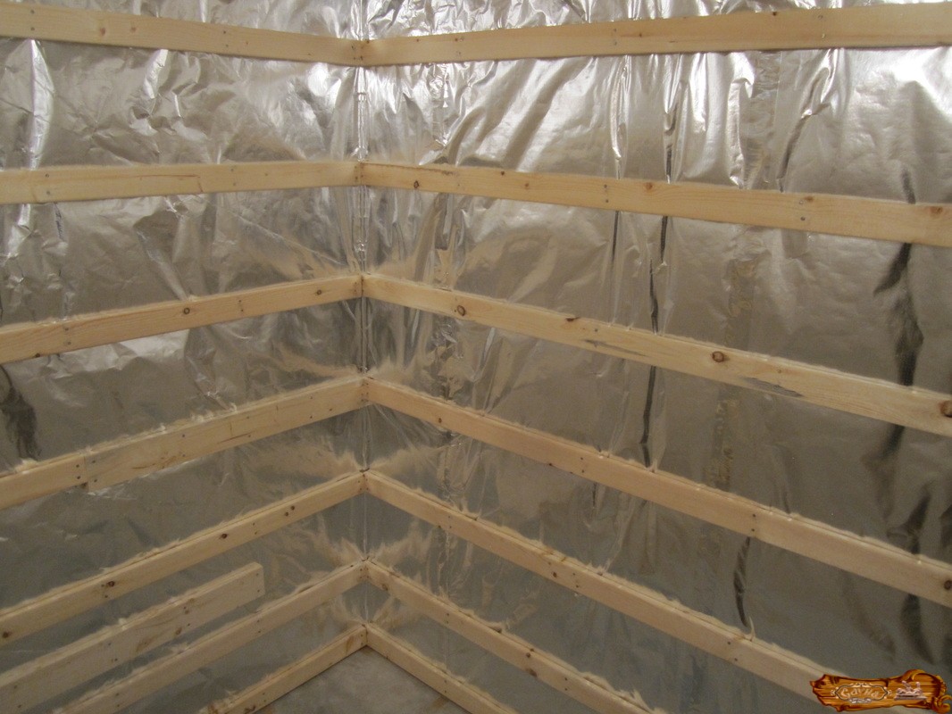 После монтажа утеплителя нужно уложить слой фольгированного пароизолятора (отражающей поверхностью внутрь сауны). Фиксация материала производится при помощи тонких реек. В качестве пароизолятора также может выступить утолщенная крафт-бумага.
